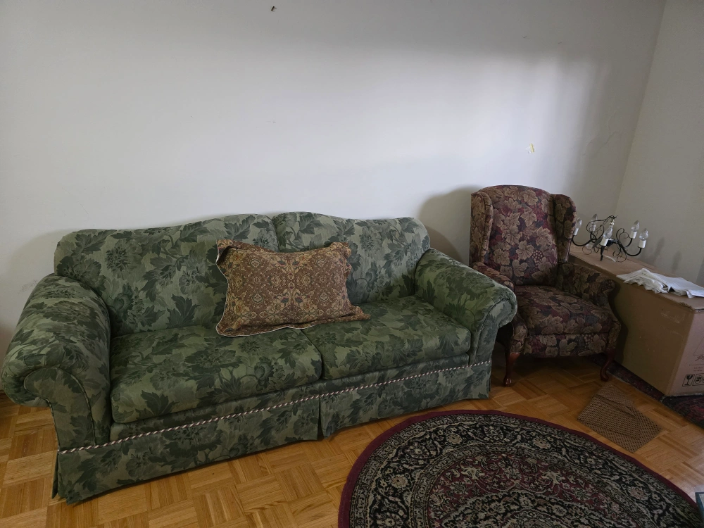 Selling a comfortable sofa and armchair set with a lovely floral pattern. The sofa features a matching pillow, and the armchair complements the set perfectly. Great for adding a touch of classic style to your living room!
