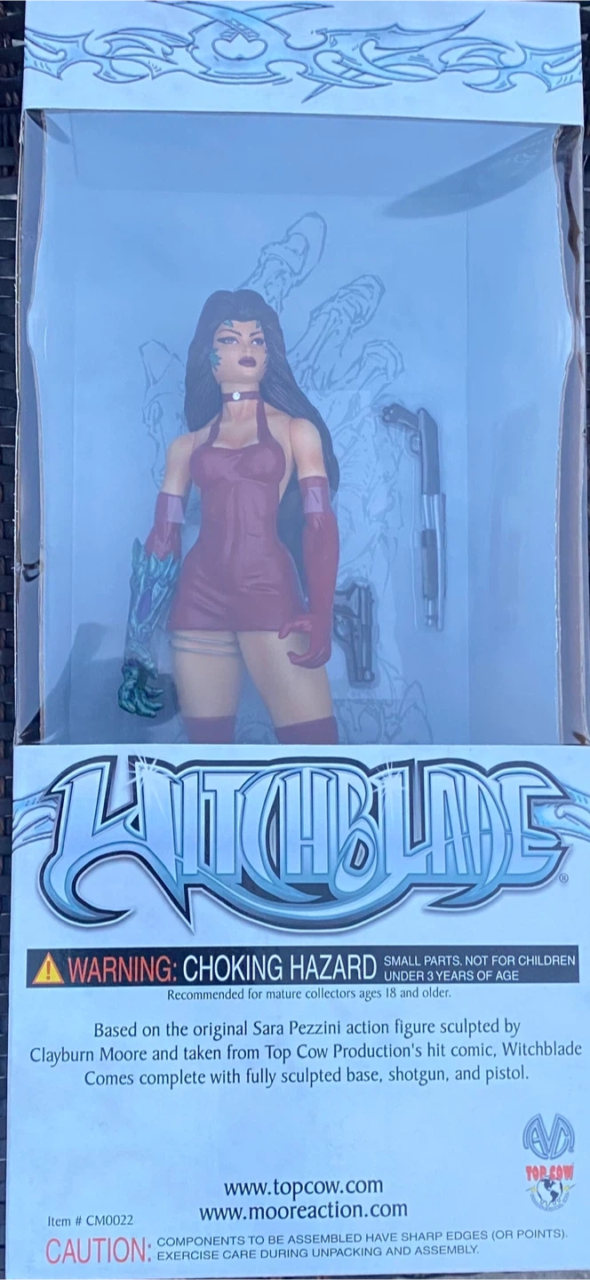 Selling a Witchblade Sara Pezzini action figure from Top Cow Productions! This figure is based on the comic book series and includes a fully sculpted base, shotgun, and pistol. Recommended for mature collectors ages 18 and older. Item number CM0022
