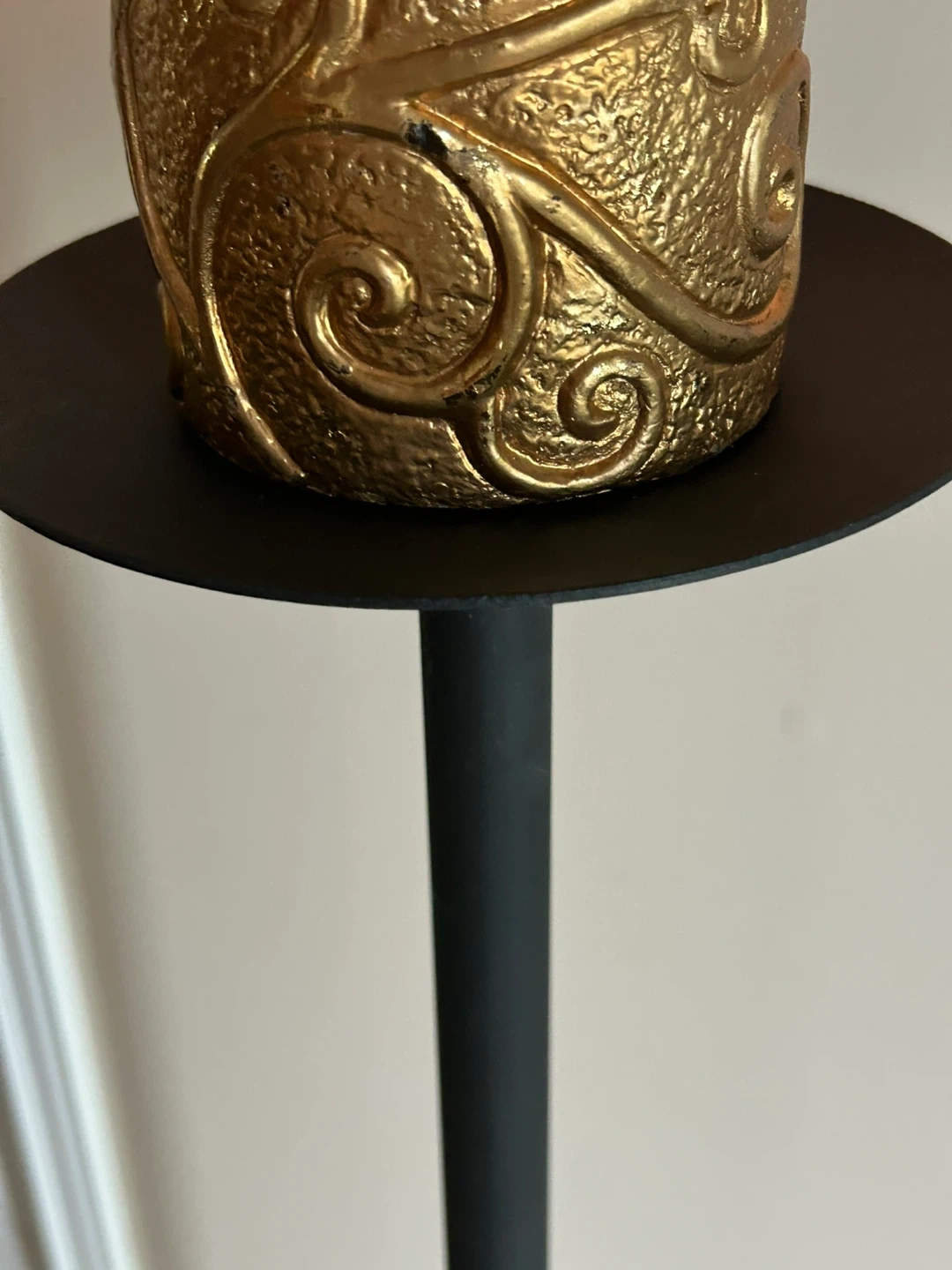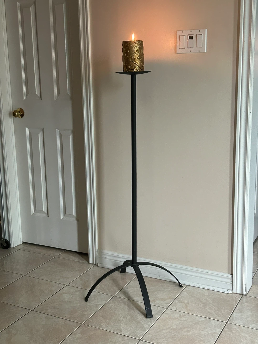Selling a black metal floor candle holder. It's in great condition and adds a touch of elegance to any room. Perfect for creating a cozy atmosphere with candlelight