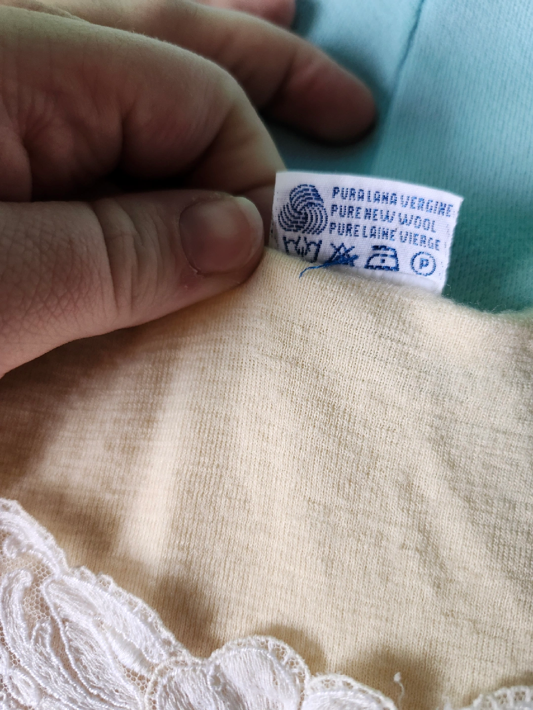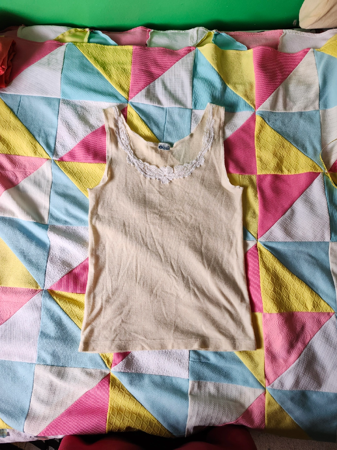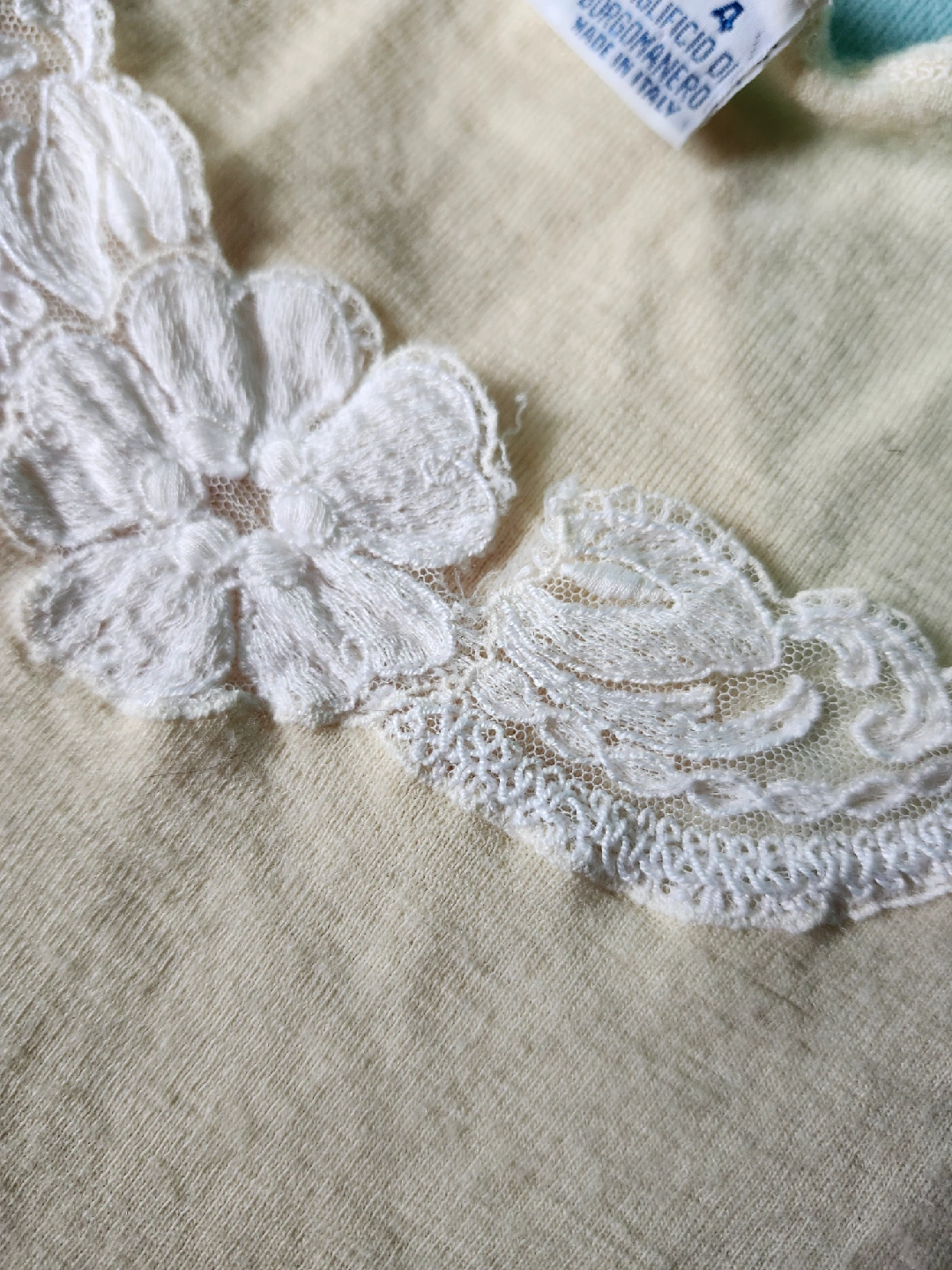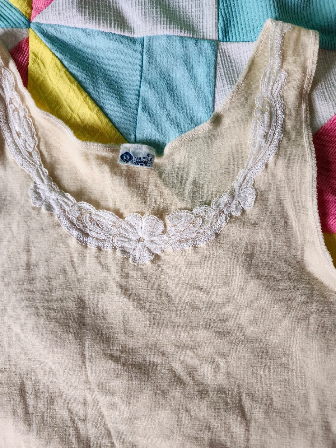 75Cream/yellow and white lace tank top this cute 70s/80s tank top is soo dreamy. made of 100% wool (but not too itchy or heavy!!) its soft to hold and has a really cute lace design around the neck. made in Italy. label size 4, but keep in mind this is vintage sizing. pit to pit laying flat measures just under 16in, and shoulder to the bottom is 24in item is in fair used condition. it has a small tear in the lace around the neck (picture 4), this isnt very visible from afar, and as the lace is stitched on to the shirt, it doesn't affect wearablity at all