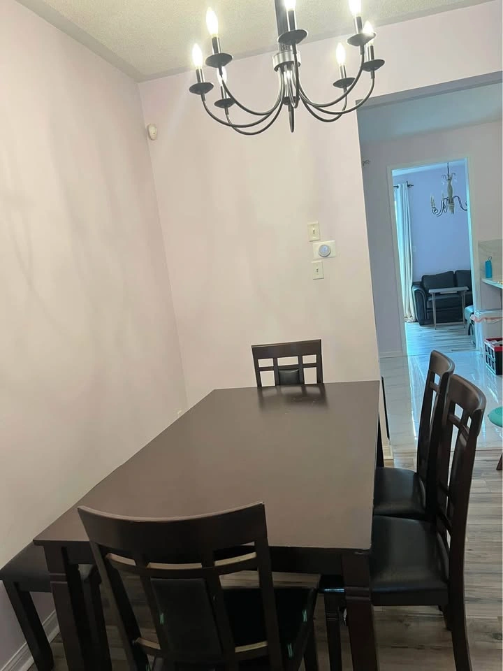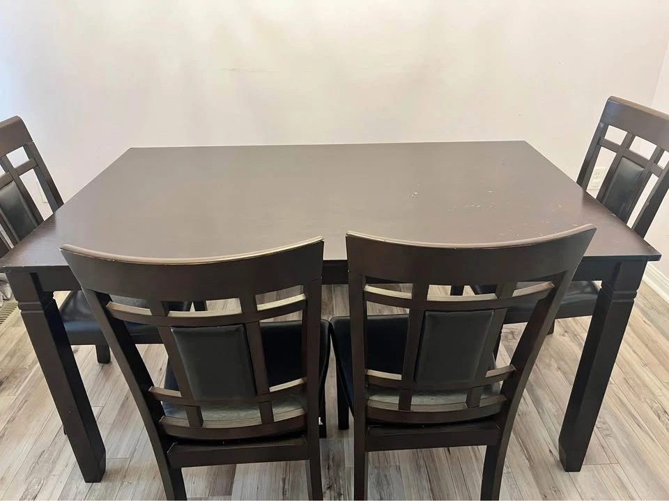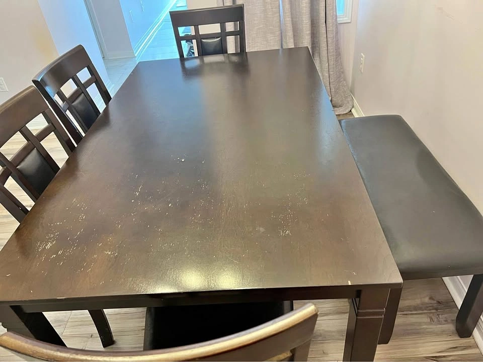 We used it without any cover, paint got slightly chipped off as seen in the picture. 2 years old. Comes with 4 chairs and a bench. Sits 6 people comfortably W: 36 In, H: 30.13 In, D: 60 In Pickup 1 minute away from Garcia park, Mississauga (credit view rd & Brittania Rd W)