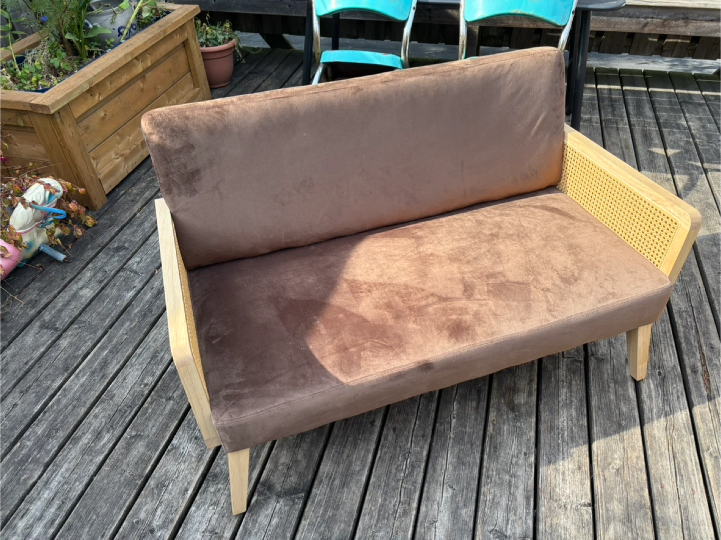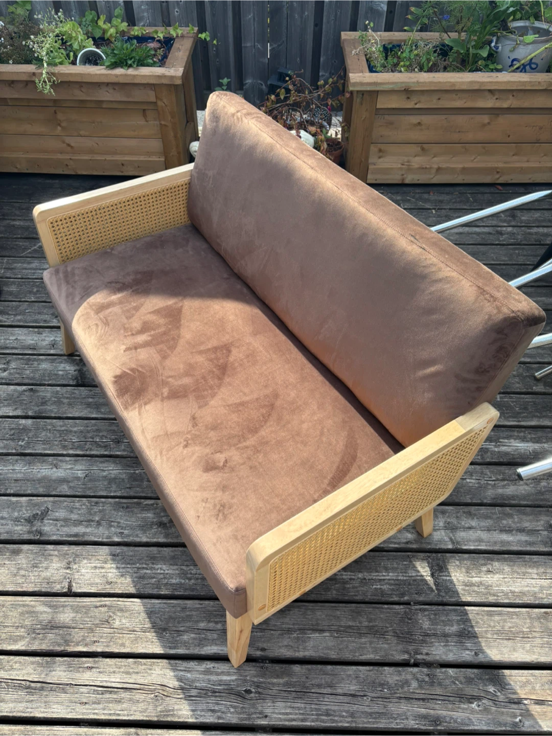 Light brown coloured microsuede material with wooden arms and legs and rattan siding.