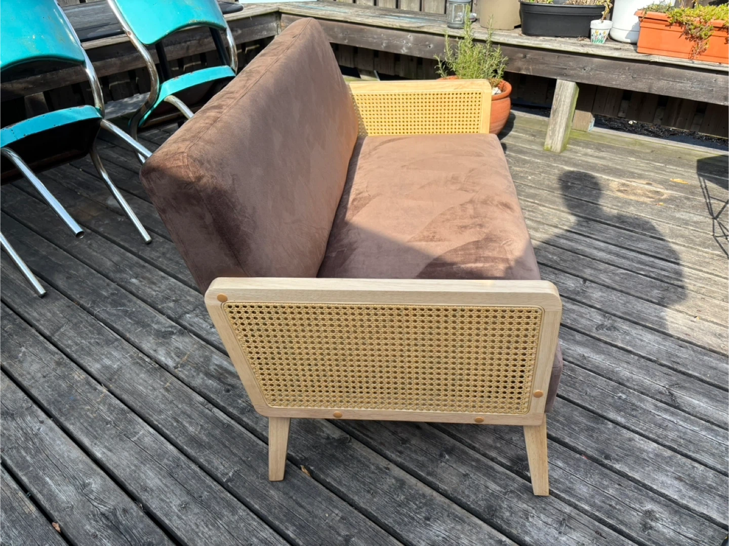 Light brown coloured microsuede material with wooden arms and legs and rattan siding.