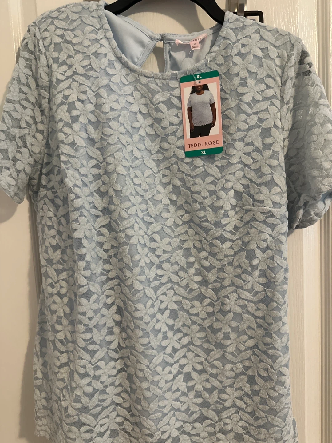 Here's a Teddi Rose lace top in size XL and L. It's a beautiful light blue color and features a delicate floral lace pattern. Perfect for adding a touch of elegance to any outfit.
