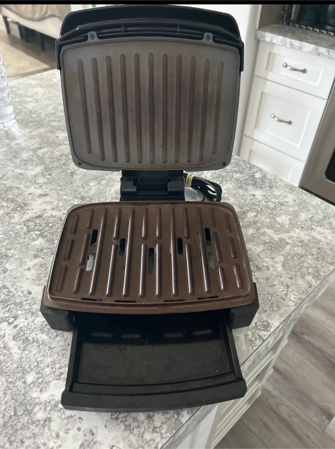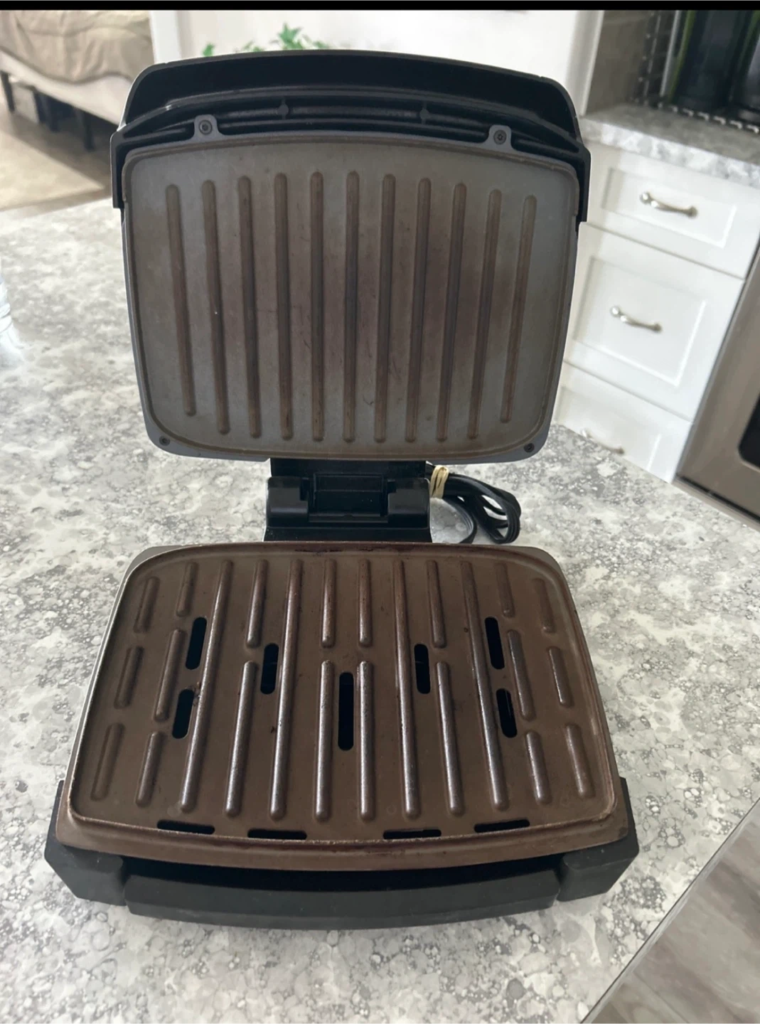 Selling a George Foreman grill. It has some signs of use, as shown in the pictures, but it's still perfectly functional for making delicious grilled meals