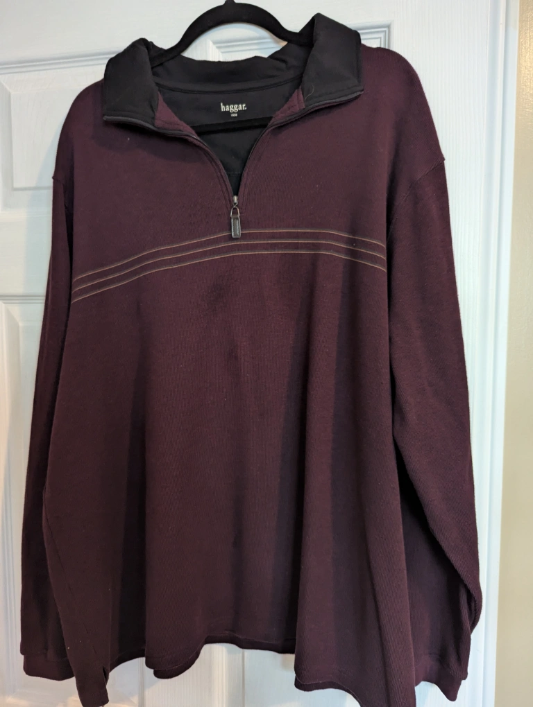 Cozy Haggar quarter zip pullover in a lovely burgundy colour! The material is soft and comfortable, perfect for layering during the cooler months. It's in great condition and ready for a new home! Size, xxl. SFH