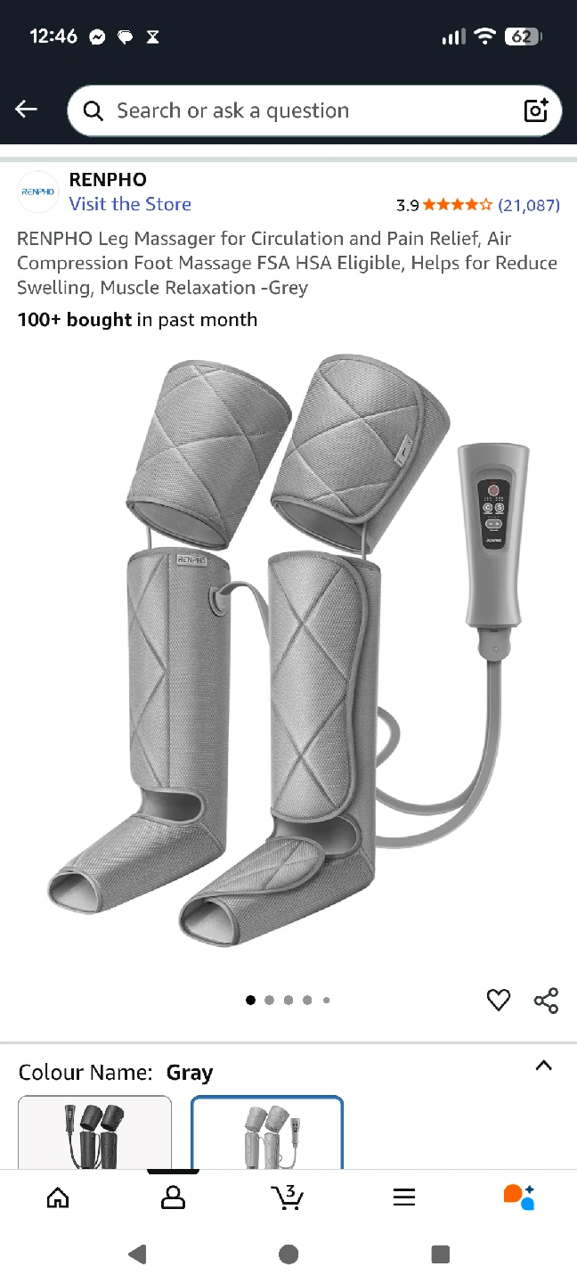 I'm selling a RENPHO Leg Massager in grey. It's designed for circulation and pain relief, using air compression. It's FSA and HSA eligible and helps reduce swelling and muscle relaxation. Husband had surgery and used for 2 weeks while laying in bed. Don't need anymore. Like new.