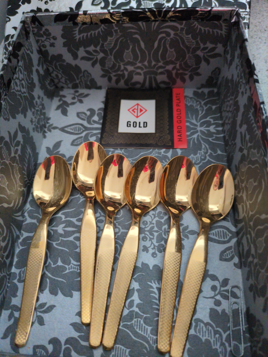 Set of 6 gold-plated spoons, still in their original box! These spoons are from Hard Gold Plate and feature a unique textured handle. Perfect for adding a touch of elegance to your table setting