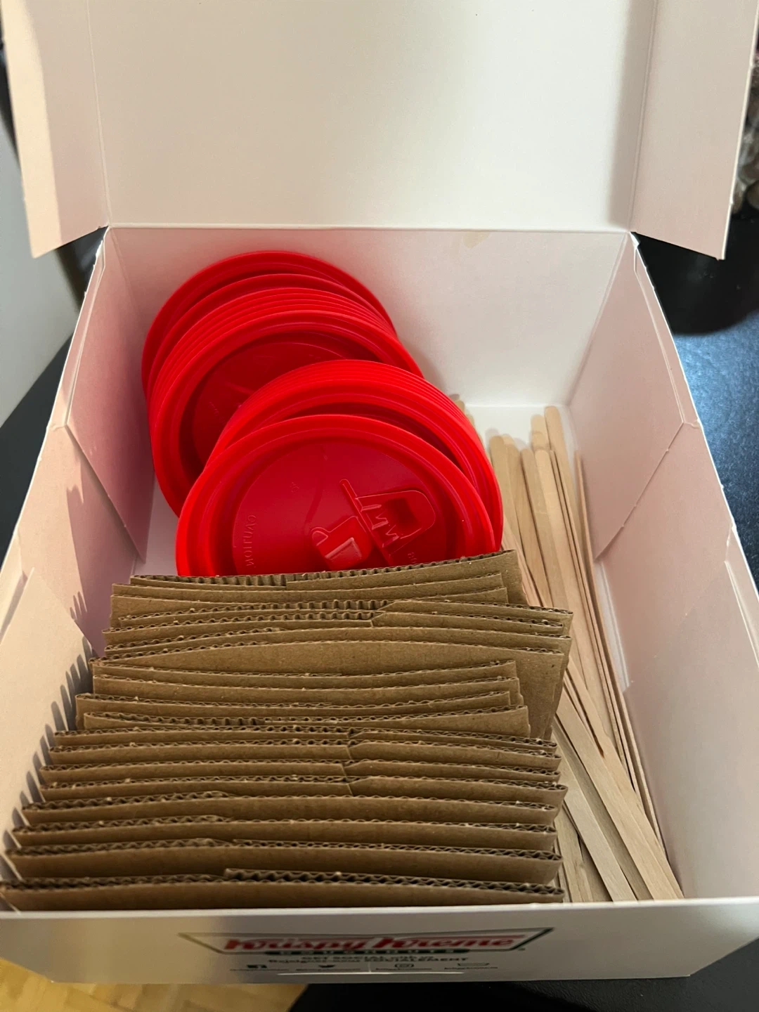 Free Krispy Kreme box that includes red lids, cardboard dividers, and wooden stir sticks. Perfect for crafts, storage, or events!