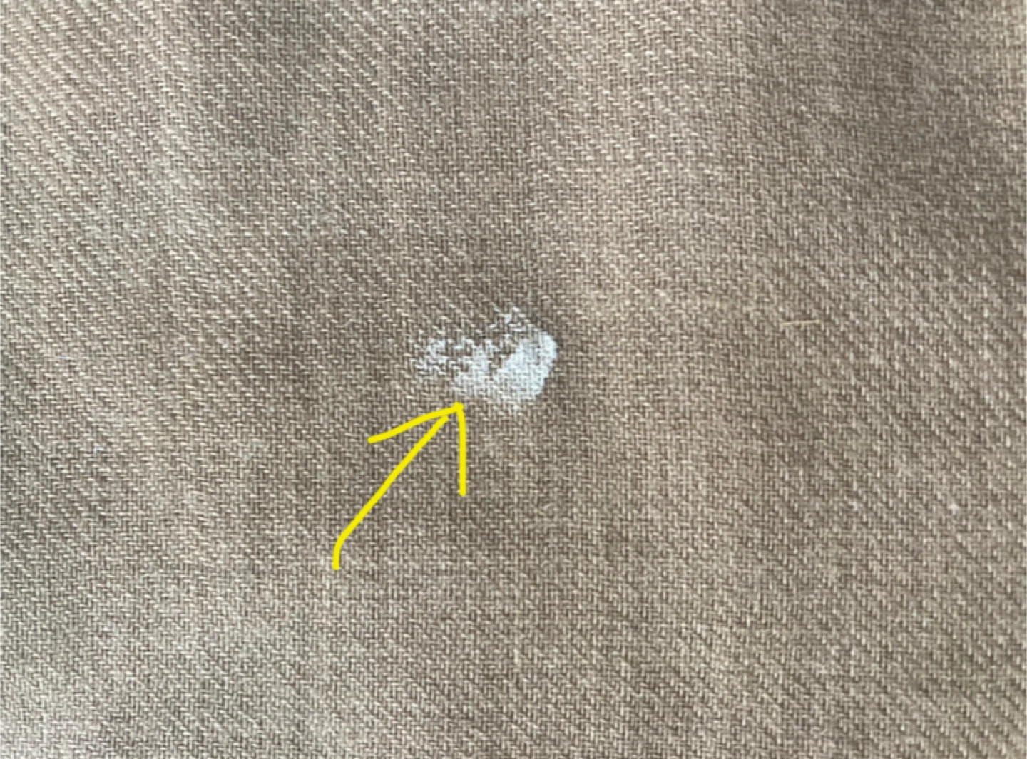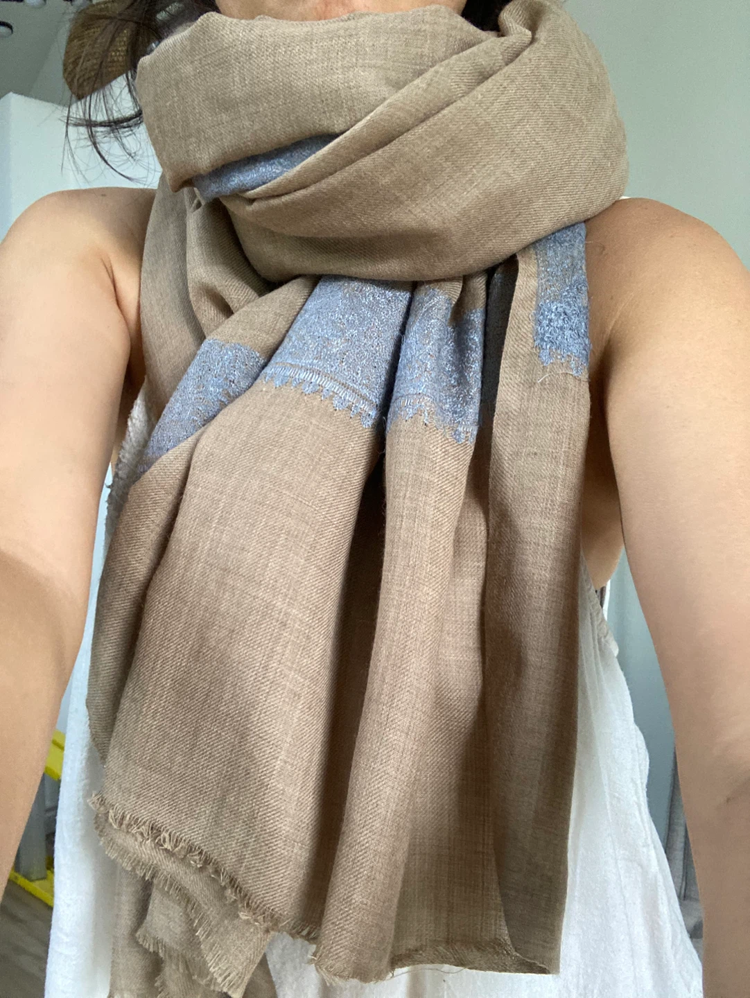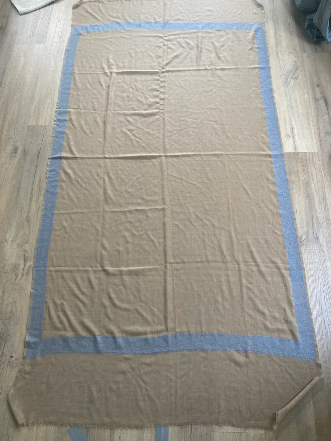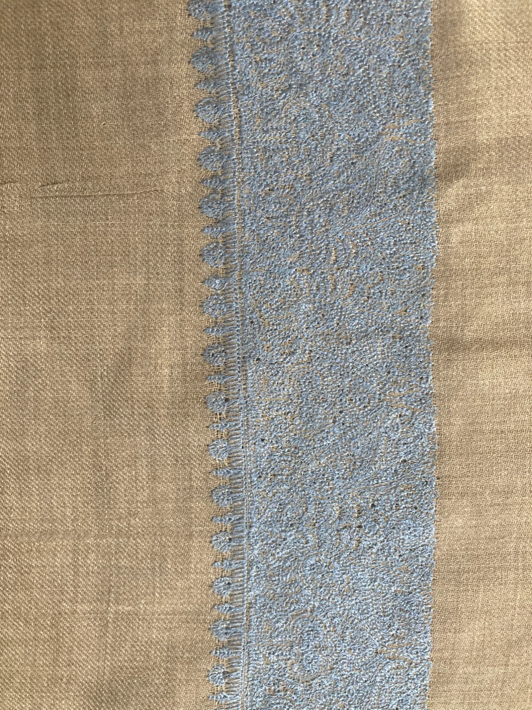 Neutral sand colour with contrasting light blue embroidery. Has some imperfections (see pics) but otherwise in good condition.
