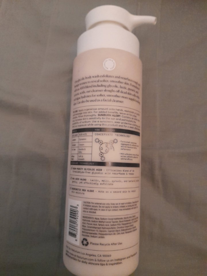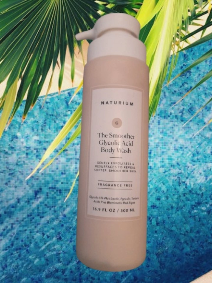 a bottle of Naturium The Smoother Glycolic Acid Body Wash. It gently exfoliates and resurfaces to reveal softer, smoother skin. It's fragrance free and contains glycolic 5% plus lactic, pyruvic, tartaric acids plus biomimetic red algae. Bottle size is 16.9 FL OZ / 500 ml