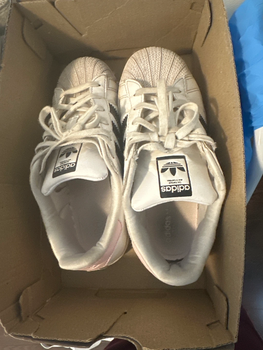 Selling a pair of Adidas Superstar sneakers in size 1. They show some signs of wear but are still in good condition. Comes with the original box!