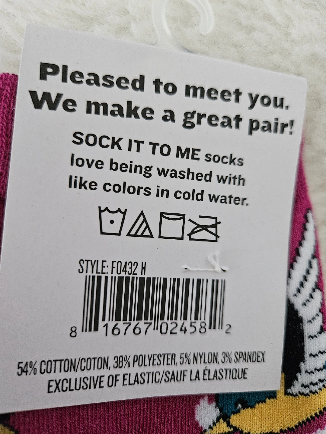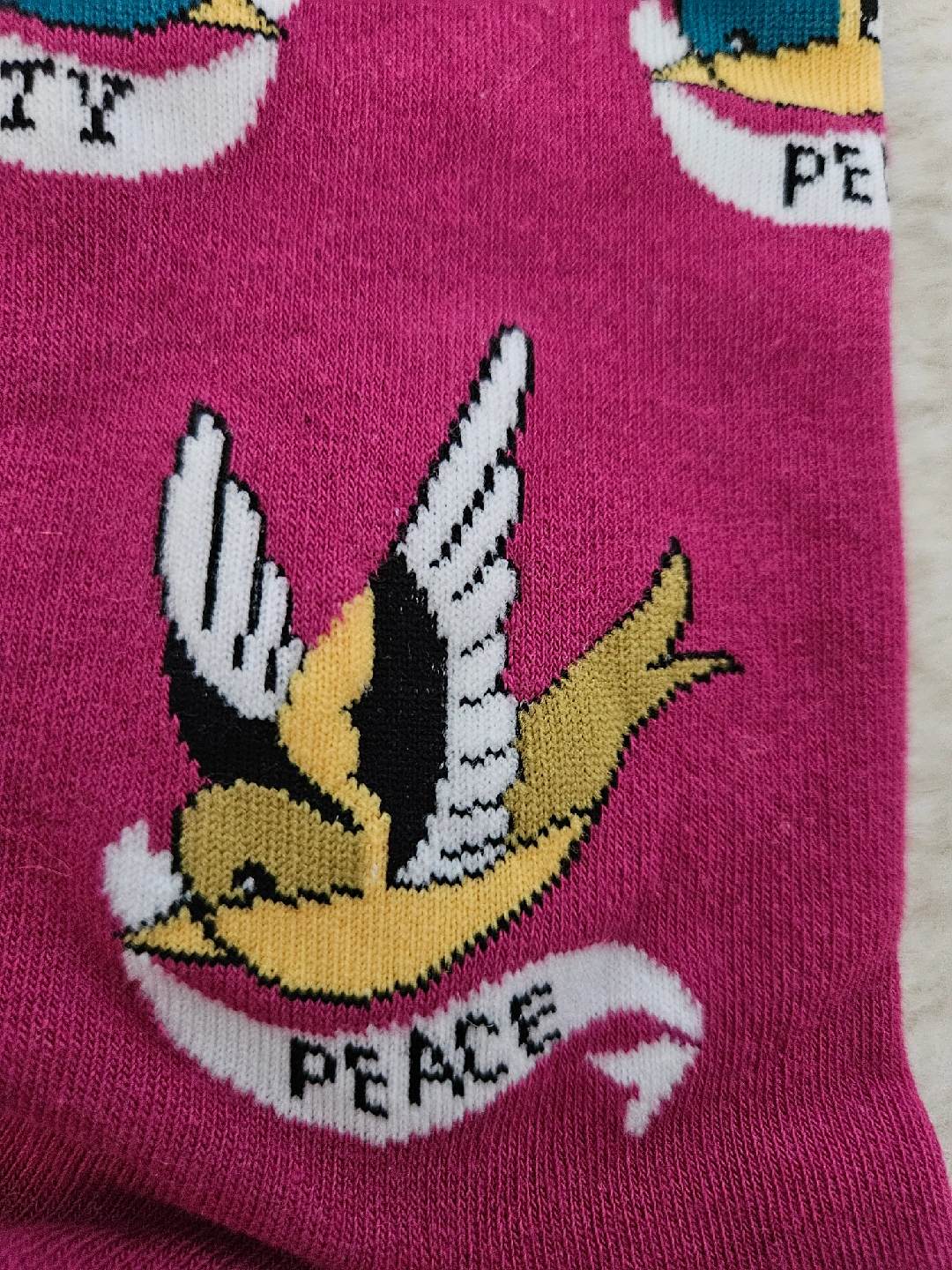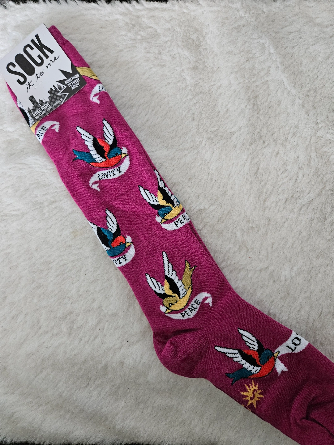 Cute pair of Sock It To Me knee high socks! They're a fun magenta colour and feature bird designs with words like 'Unity,' 'Peace,' and 'Love' on them