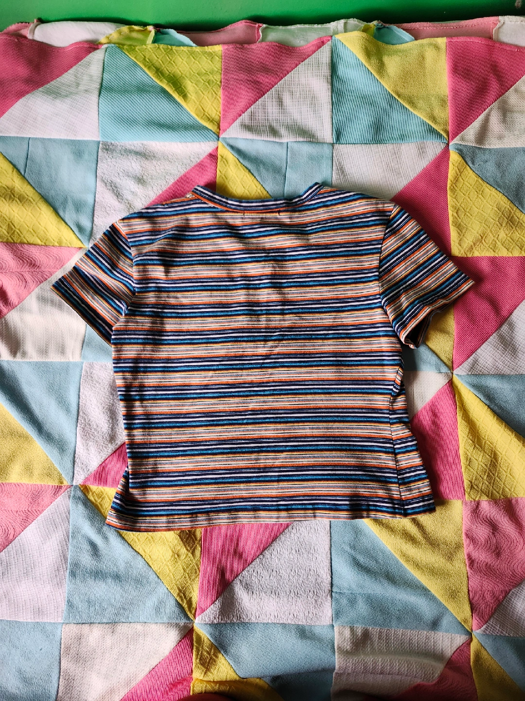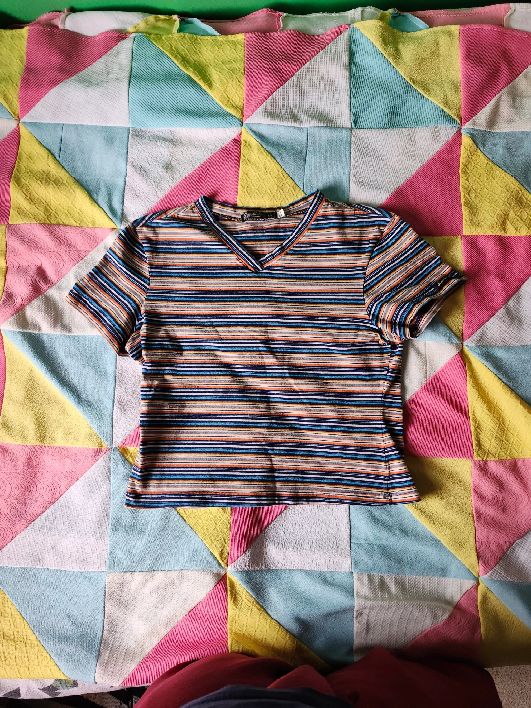 75Multi-coloured striped Guess baby tee super cute 90s/00s Guess baby tee! has a vneck cut and multi coloured stripes Label size L, pit to pit laying flat is just under 17.5in, shoulder to bottom is just about 18in (back and front layering overlaping in photo, makes it look longer) item is in good used vintage condition with no flaws that I could notice