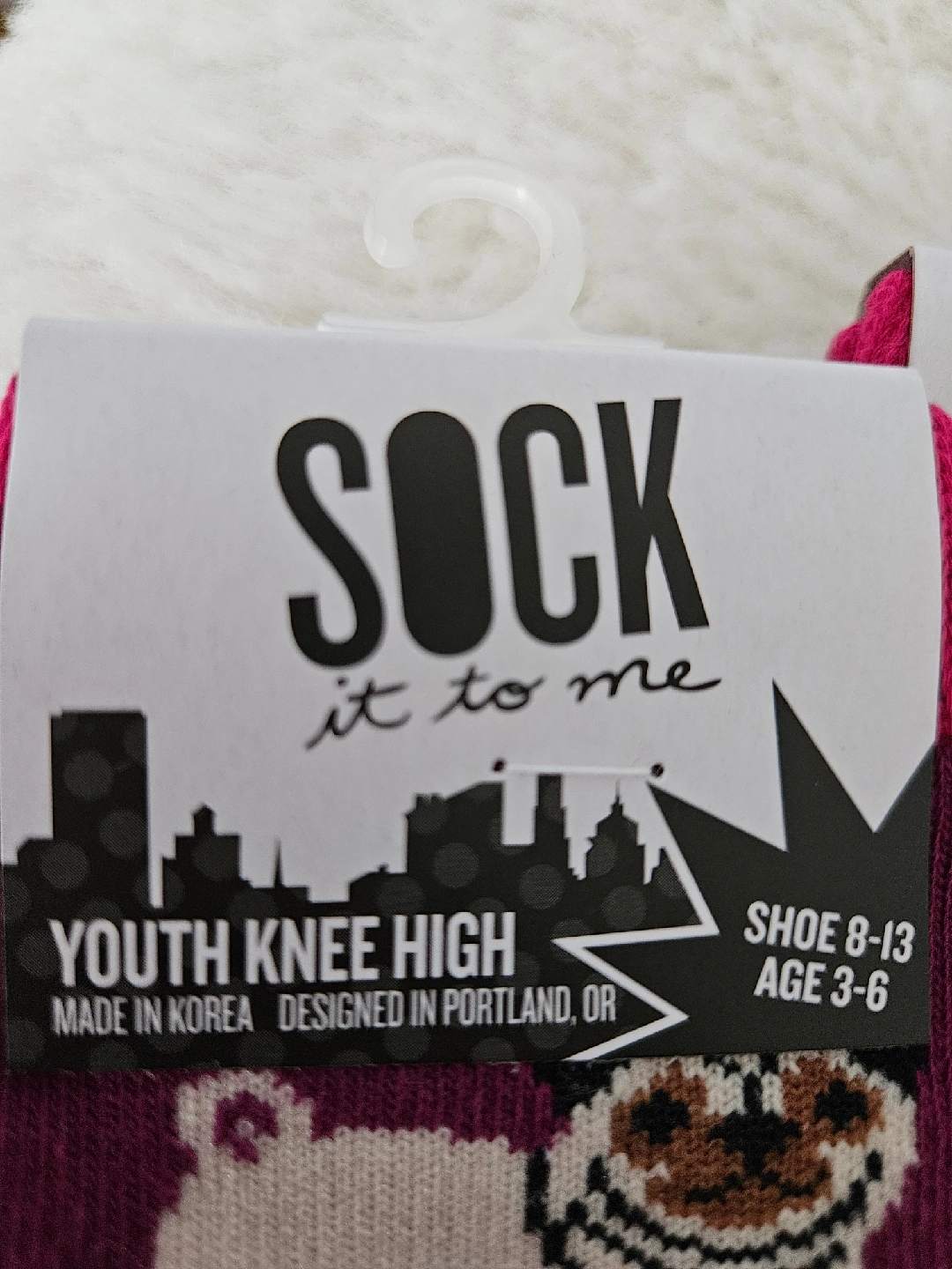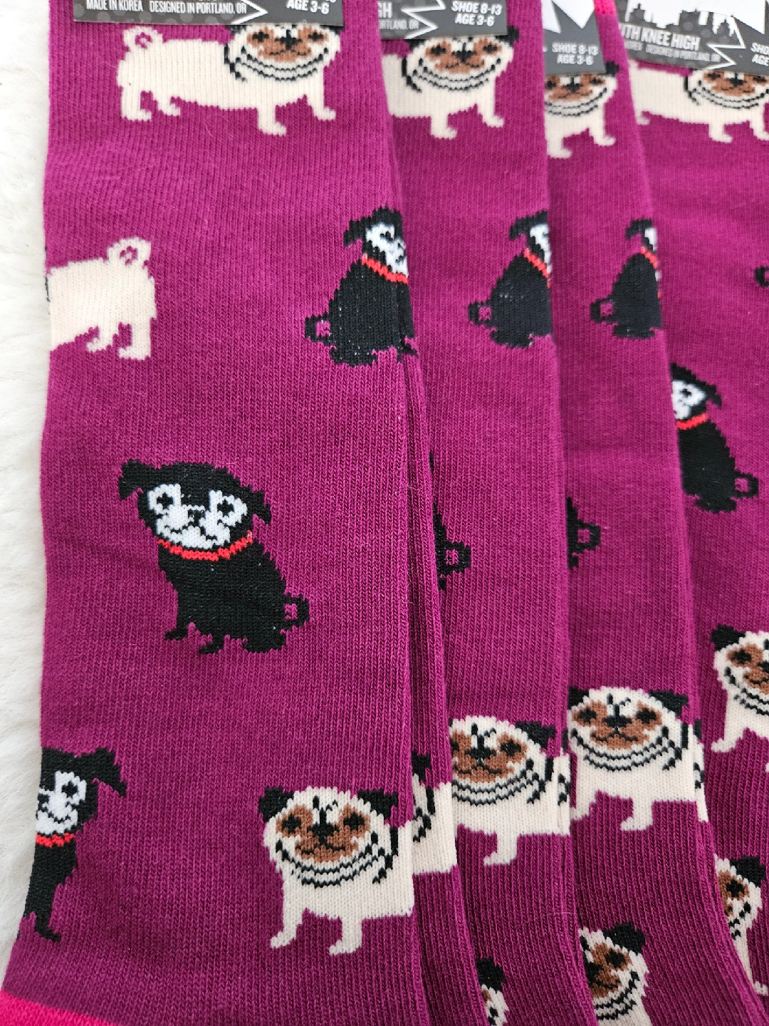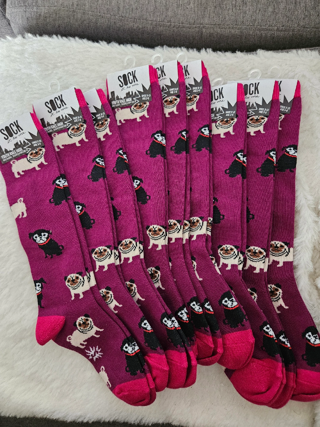 I'm selling a new pair of Sock It To Me youth knee socks! These socks are in the 'Pug Life' design and are sized for youth shoe sizes 8-13, recommended for ages 3-6. They're made of 69% cotton, 29% polyester, and 2% spandex. Super cute!