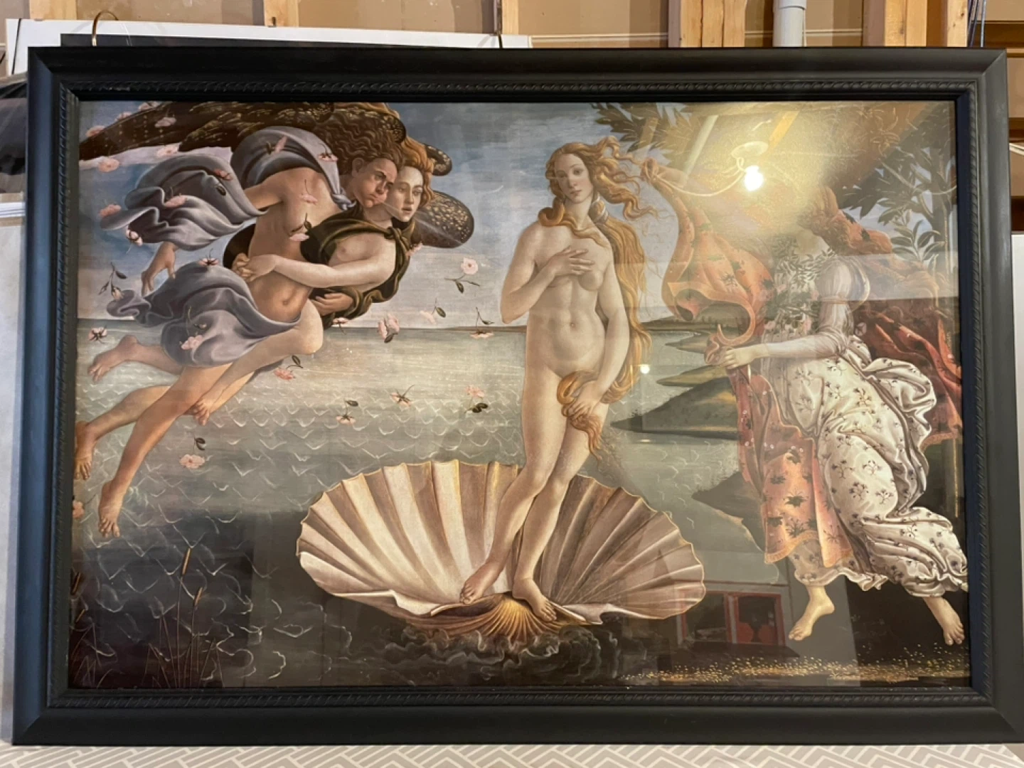 This art poster in glass and framed is The Birth of Venus by Sandro Botticelli. It sells for framed on Wayfair for $250. 28x40 inches. FYI…. It is very heavy. If you like Renaissance art, then this is for you. Check out my listings for more.