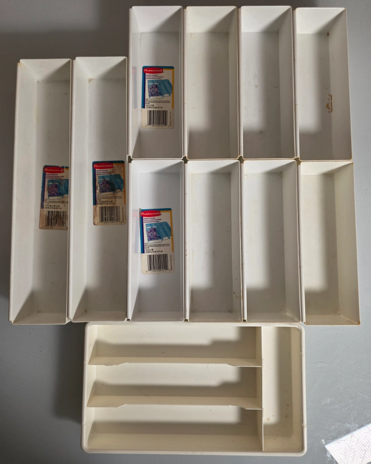 Selling a set of 11 Vintage Rubbermaid Drawer Organizers. They're great for keeping your drawers neat and tidy. Perfect for organizing cutlery, office supplies, or anything else you need to keep in order.
