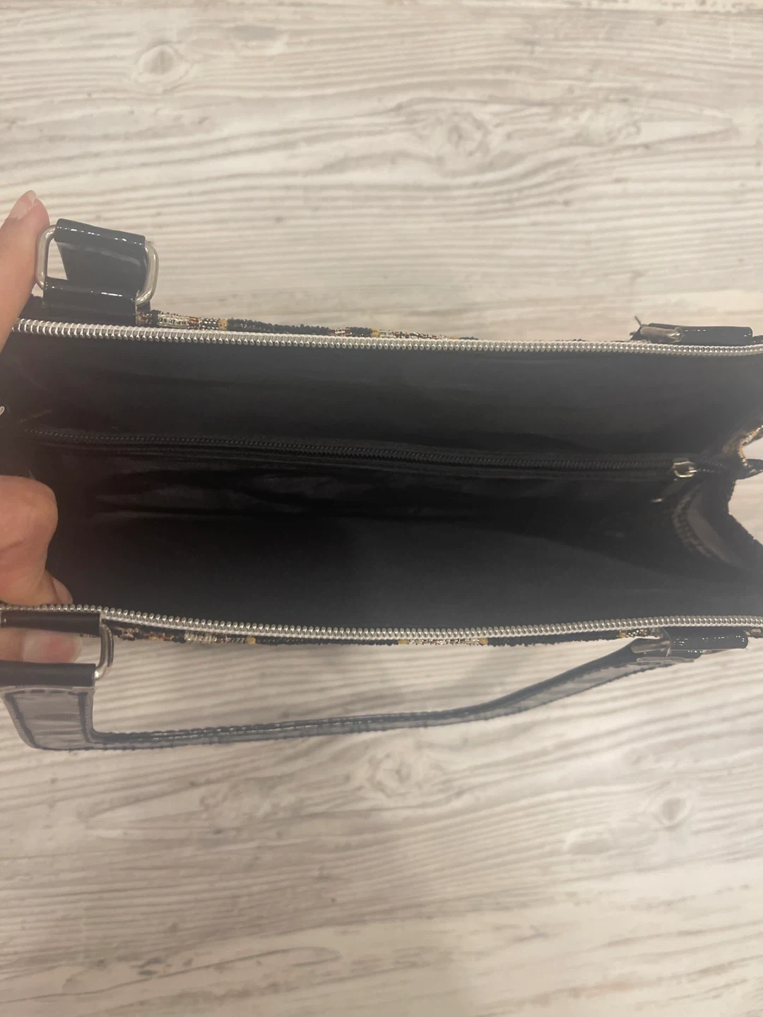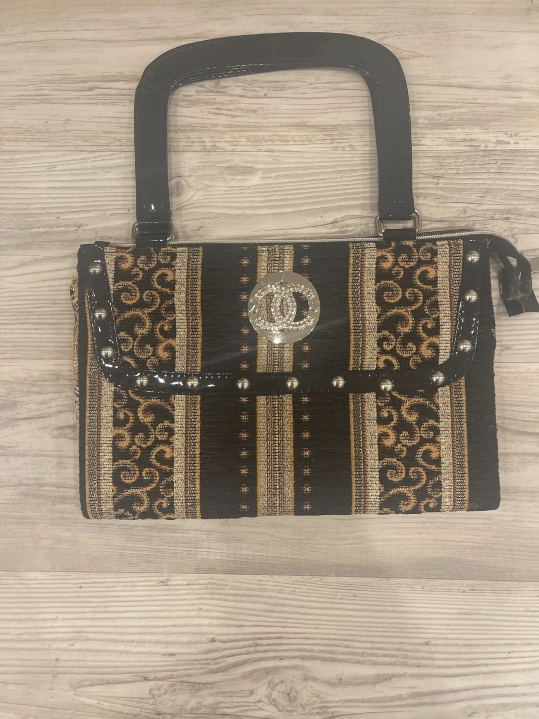 10Vintage tapestry handbag with a unique design! It features a black handle and a decorative emblem. The interior is lined and includes a zipper pocket. Set price cash payment only.