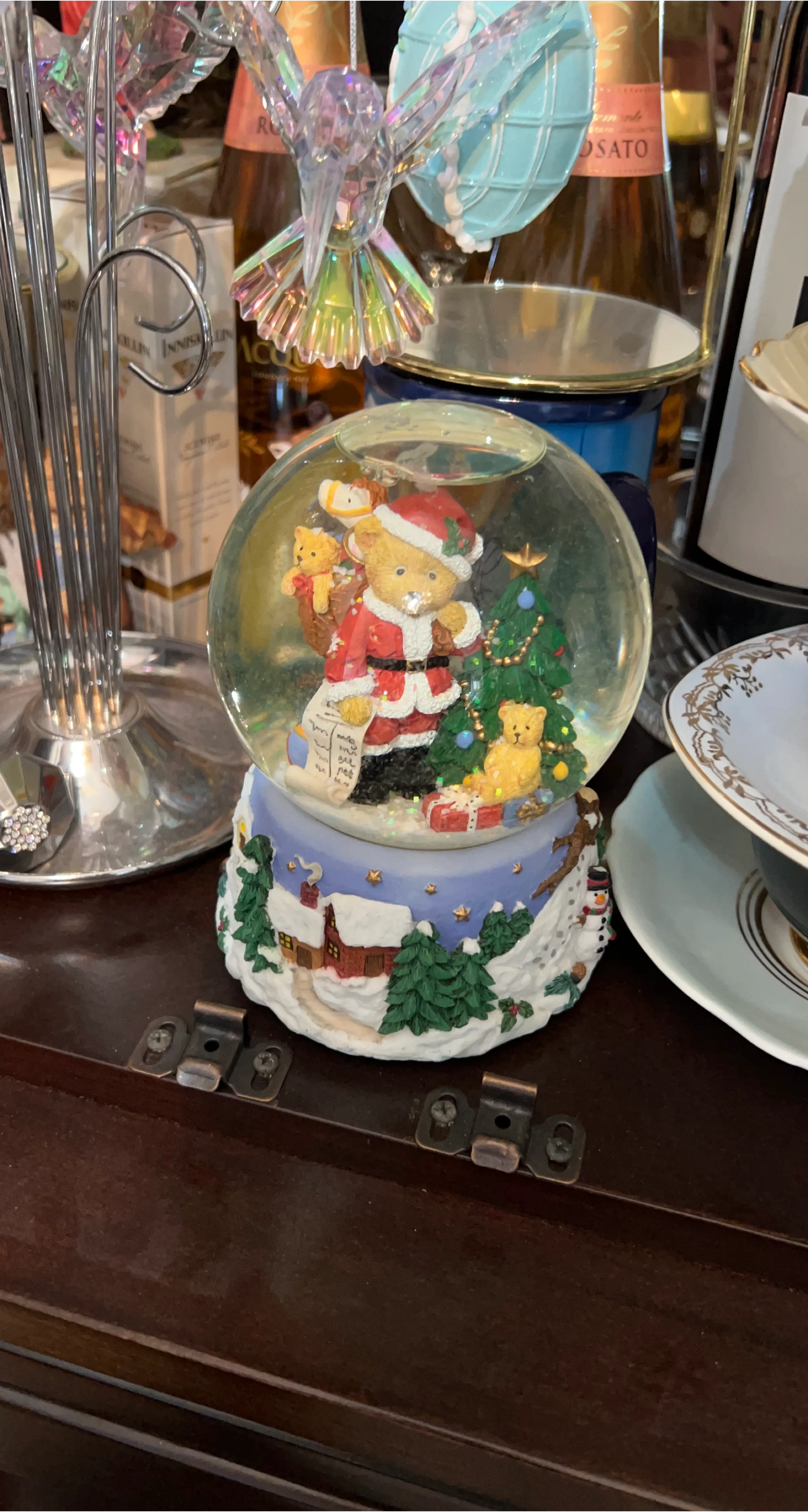 A charming Christmas musical snow globe featuring a teddy bear dressed as Santa next to a Christmas tree! The base has a wintery scene with a snow-covered house and trees. It's a lovely decorative piece for the holiday season.