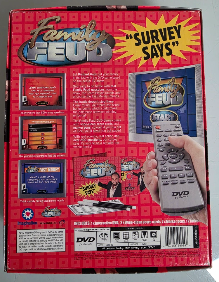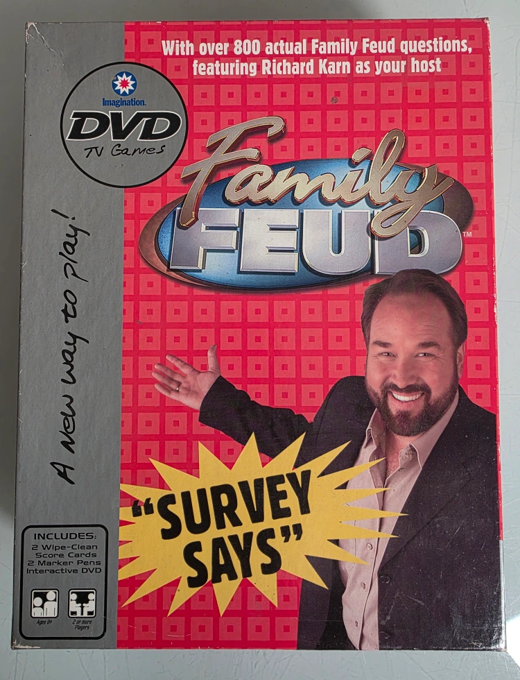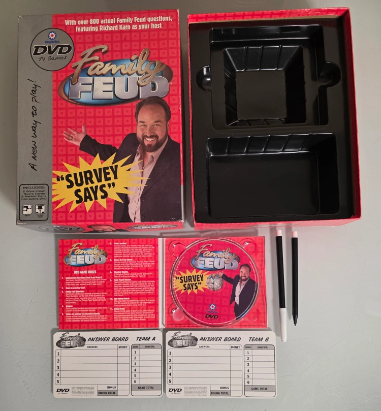 Buy & Sell2004 Family Feud DVD Game2004 Family Feud DVD Game$10Selling a Family Feud DVD TV Game. It includes: - 1 Interactive DVD - 2 Wipe-Clean Score Cards - 2 Marker Pens Check out my other listings. /CSConditionGoodWHERE TO MEETNorthside Near Bronx BowlingView MapSELLERverifiedCoreyAthlone1226 reviews0 chats·0 favorites·4 viewsSEND CHAT TO SELLERHi Corey! I’m interested in your listing.Hi Corey! I’m interested in your listing.Get the Karrot app to chatSign In to chat