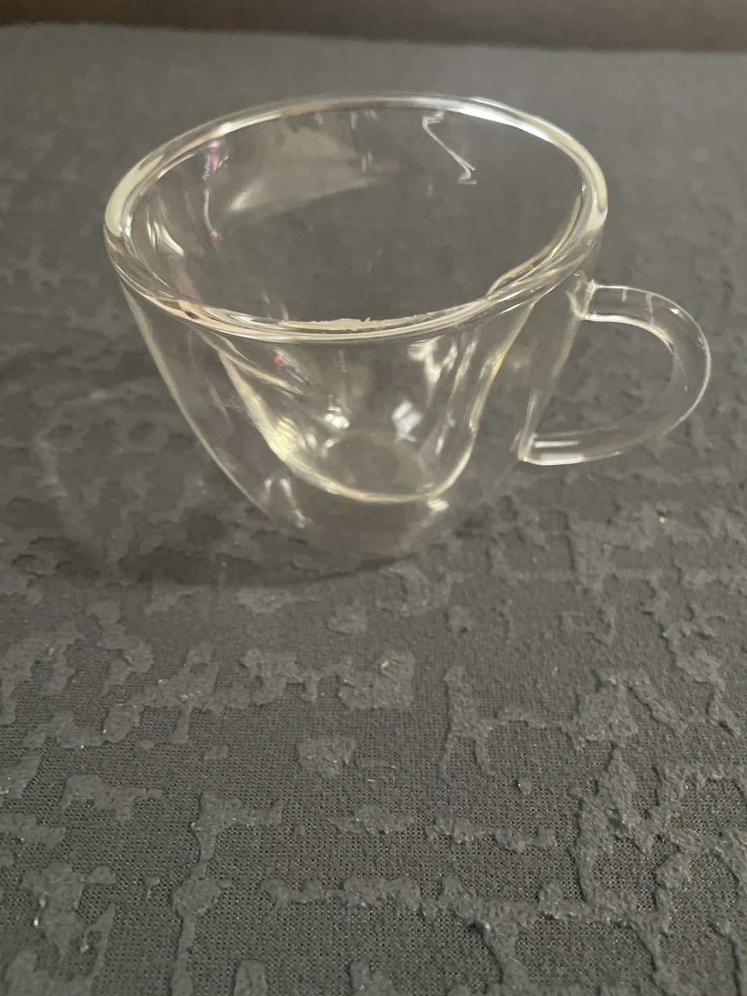 Selling a clear glass coffee mug with a double-walled design! It's in great condition and perfect for keeping your coffee hot while staying cool to the touch