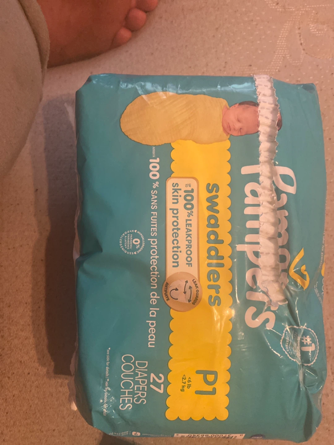 Selling a pack of Pampers Swaddlers diapers, size P1. This pack contains 27 diapers, perfect for newborns up to 6 lbs (2.7 kg). They offer 100% leakproof skin protection and have leak guards for added security. I bought the Rong size.