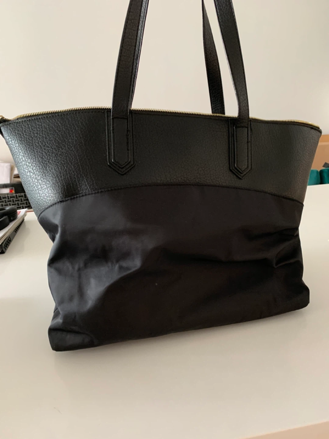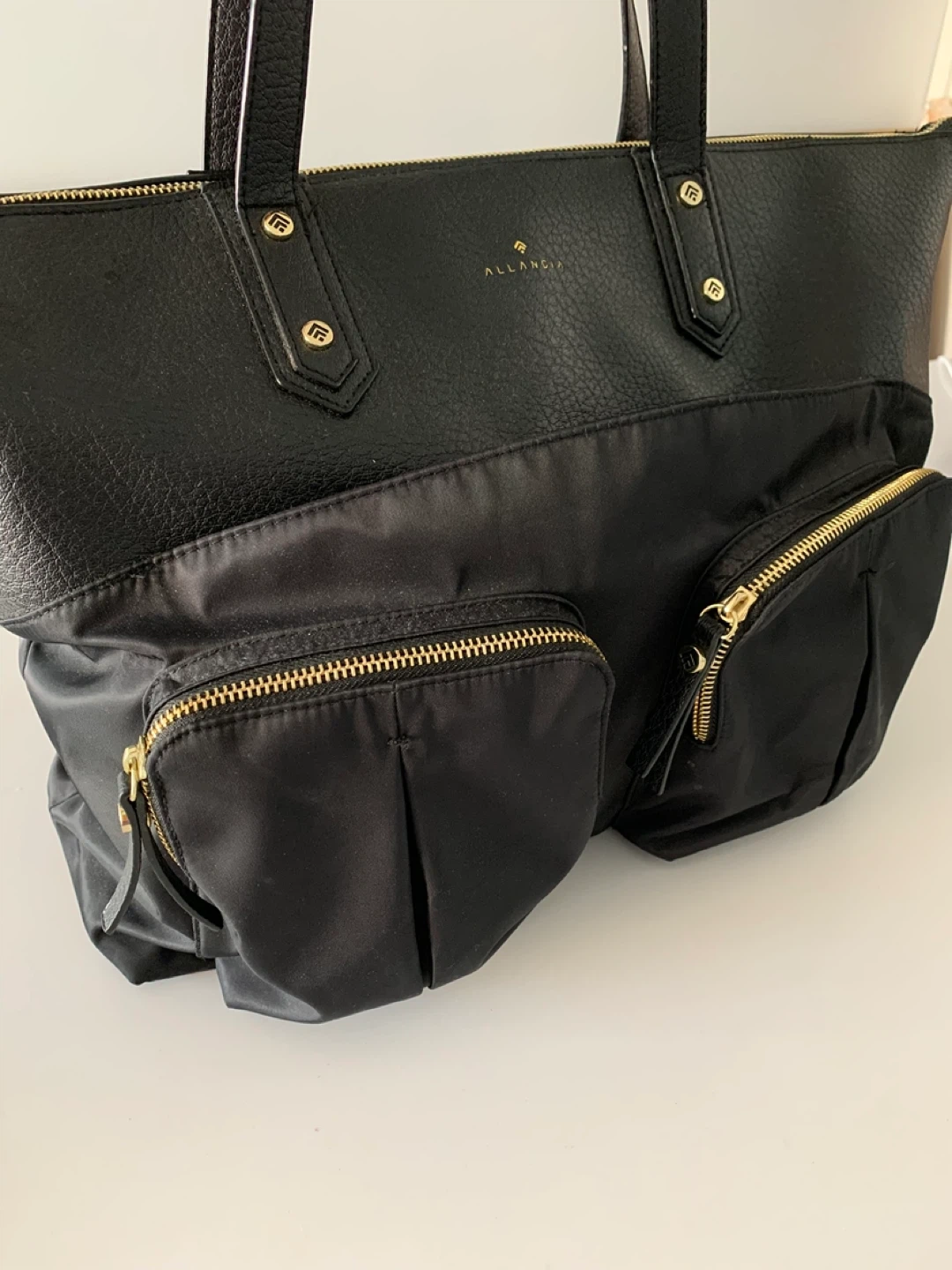 Selling a stylish Allancia tote bag in black. It features a combination of nylon and vegan leather and several handy zippered pockets. Perfect for everyday use! Slight stain inside (see last pic). Sold out online. Retails for US $130!