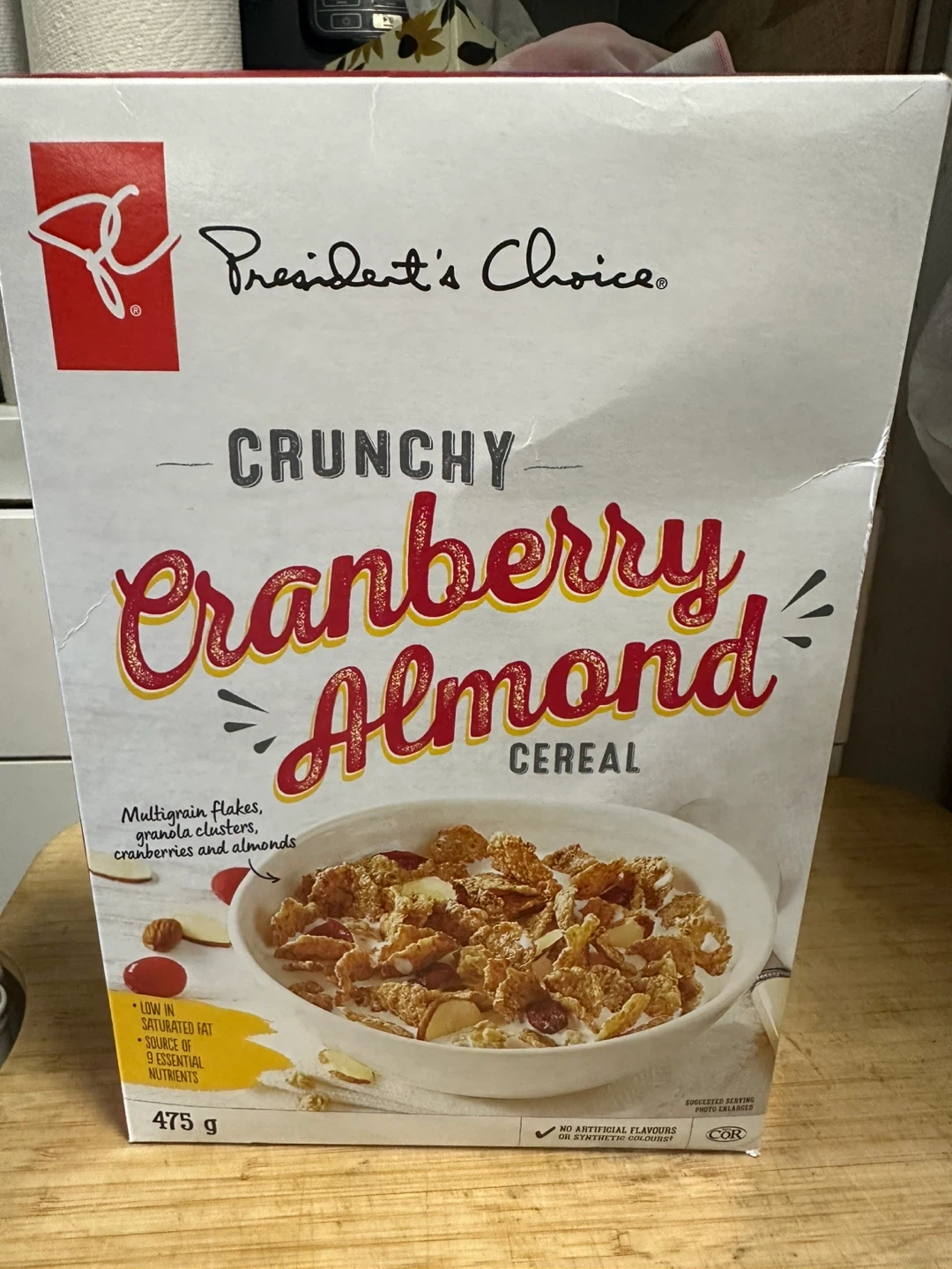 Selling a box of President's Choice Crunchy Cranberry Almond Cereal. It's a multigrain flake cereal with granola clusters, cranberries and almonds. Best Before: 2025 October 14