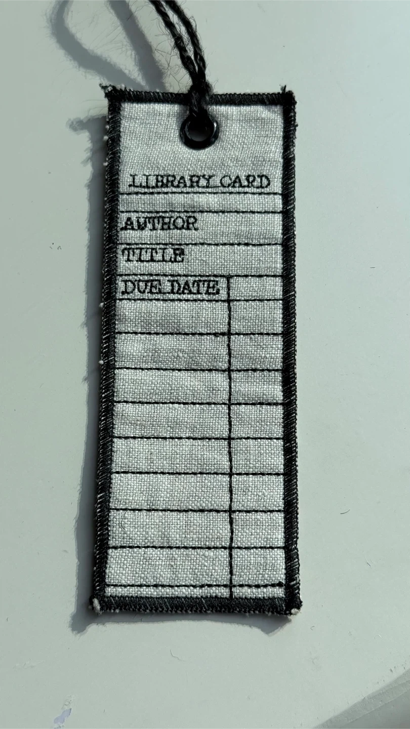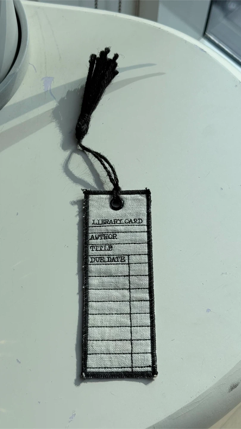 This is a cute bookmark that looks like a library card! It has a black tassel and space to write the author, title, and due date. It's in great condition and ready to mark your spot!