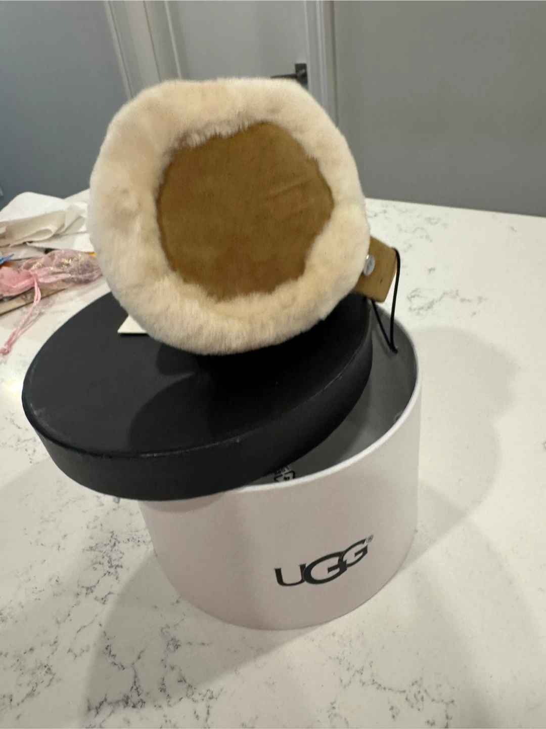 These UGG sheepskin earmuffs are brand new and come with the original box! They are a beautiful chestnut colour and a size O/S. The tag shows they originally retailed for $70. Perfect for keeping your ears warm and cozy this winter!
