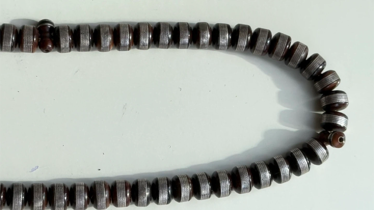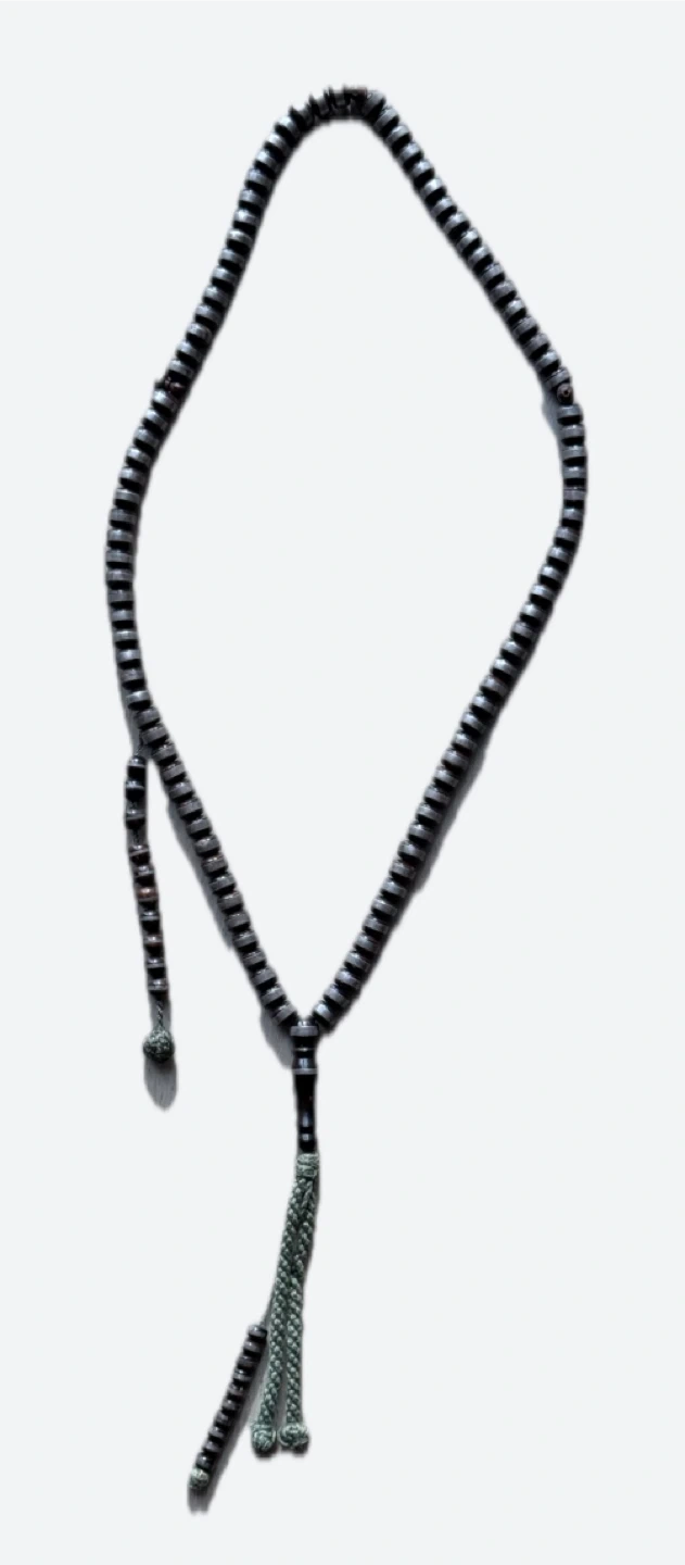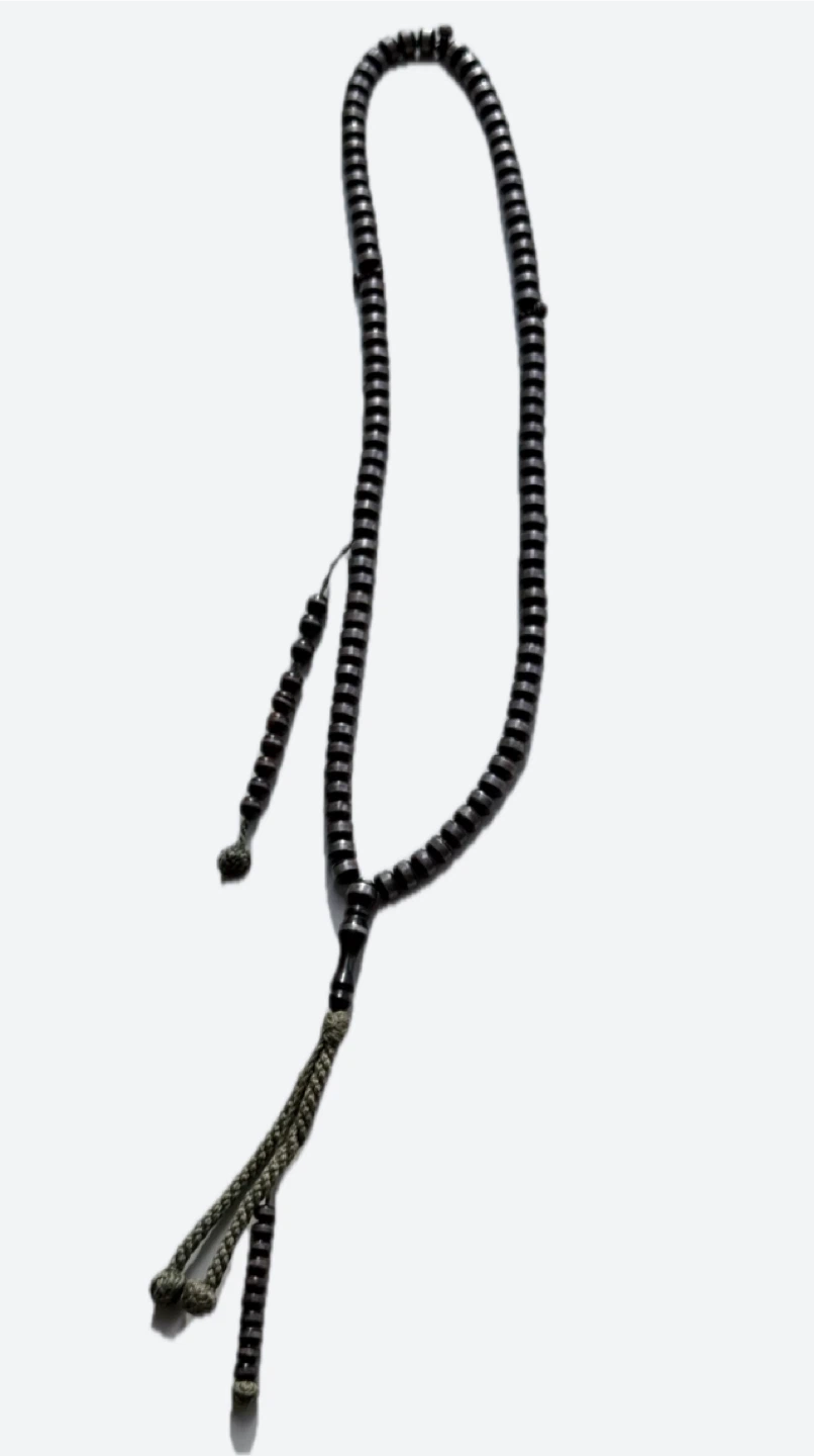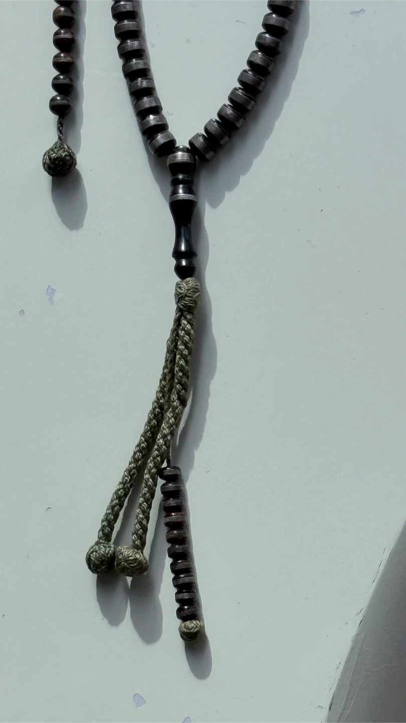 Selling prayer beads, also known as a Prayer Beads Misbaha Tasbih. The beads are a dark brown color, wrapped in silver and strung with an olive green cord. Perfect for personal reflection or as a thoughtful gift.