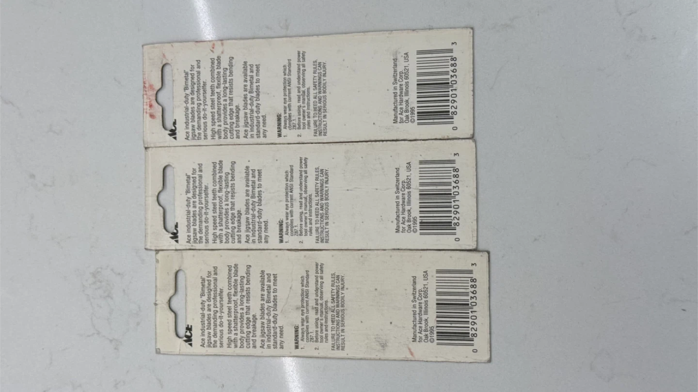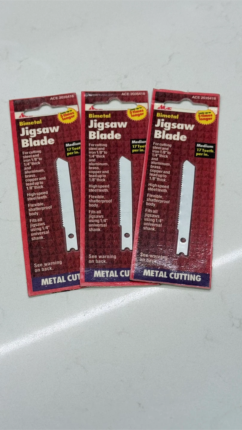 I have three ACE Bimetal Jigsaw Blades for metal cutting. These blades are medium size with 17 teeth per inch. They are designed for cutting steel and iron from 1/8" to 1/4" thick, as well as aluminum, brass, copper, and lead up to 1/8" thick. Each blade fits all jigsaws using a 1/4" universal shank and features high-speed steel teeth and a flexible, shatterproof body