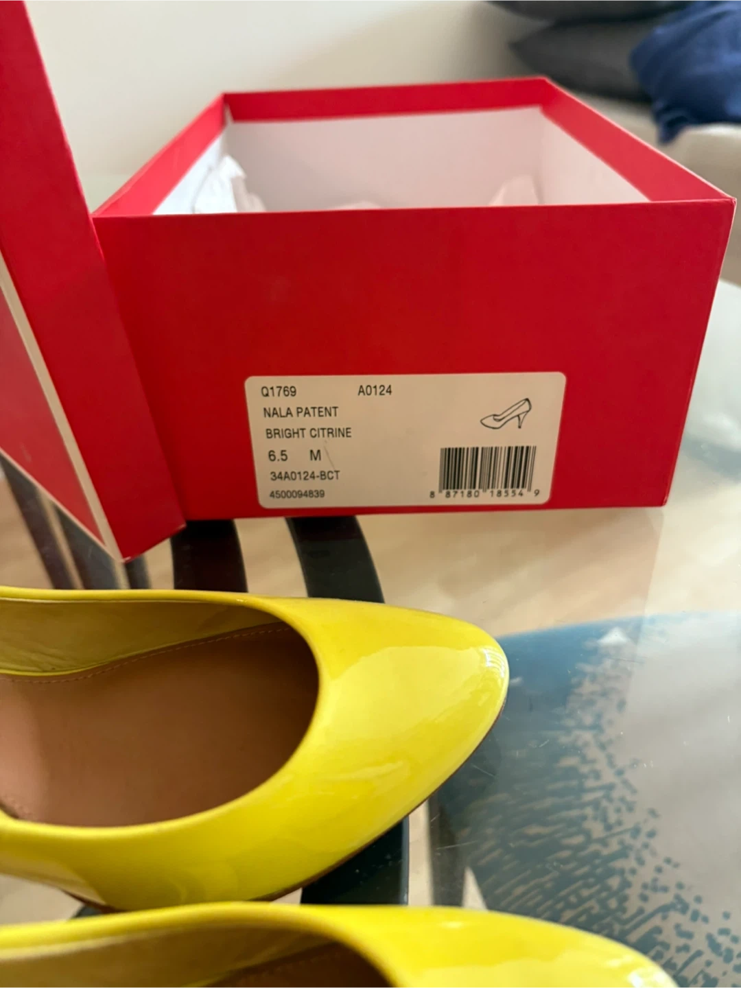 Bright citrine (colour of pics is true to real life) heels about 3.5” high in great condition. Minor minor scuff on the left back bottom of heel see pics but barely noticeable. I’d recommend getting sole covers added so it’s less slippery at the bottom. Comes with original box. Pick up near Yonge and York Mills.