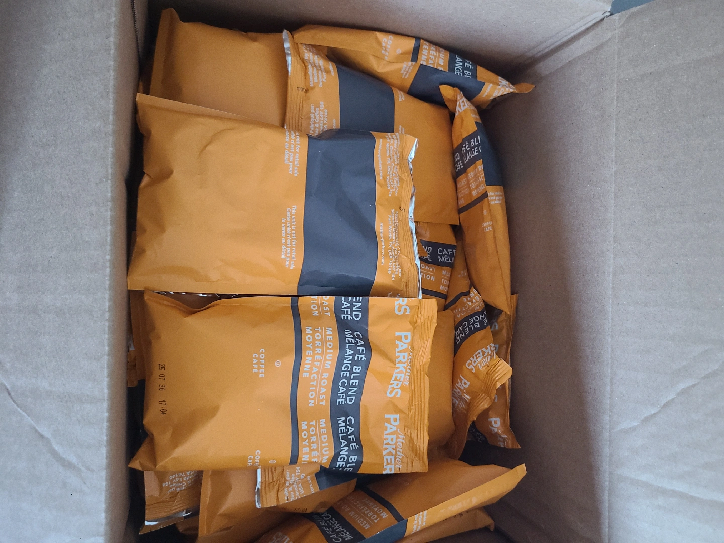 Selling a box of Mother Parker's Café Blend Medium Roast coffee. They are sealed and ready to brew! 63 bags in a box for 40$ or 1.50$ a bag.