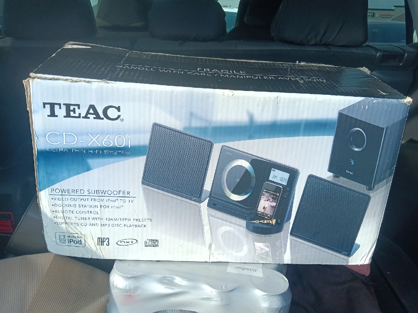 Selling a TEAC CD-X60i ultra thin Hi-Fi system. It features a powered subwoofer and supports CD and MP3 disc playback. It also has a digital tuner with 10 AM/FM presets, video output from iPod to TV and a docking station for iPod. Box included
