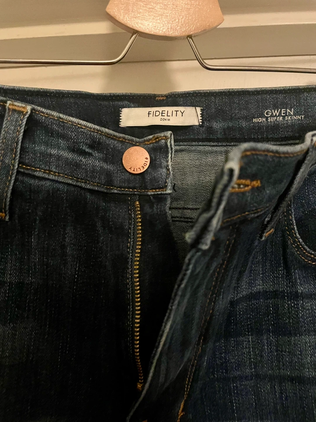 Selling a pair of Fidelity Gwen High Super Skinny jeans in size 31! They're in great condition and ready for a new home. The material is a comfortable blend of cotton and elastane, perfect for everyday wear