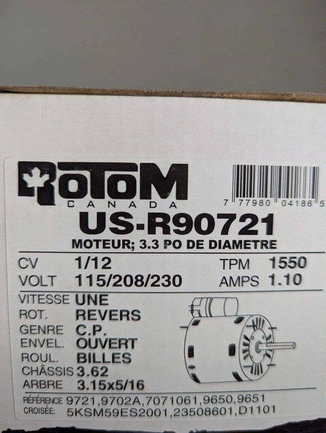 10Rotom US-R90721 Reversible Dual Voltage High Efficiency Permanent Split Capacitor Motor, 1/12 hp, 1-Speed, 1400 – 1550 RPM, 115/230V. 2 AVAILABLE. $100 EACH OR $180 FOR BOTH