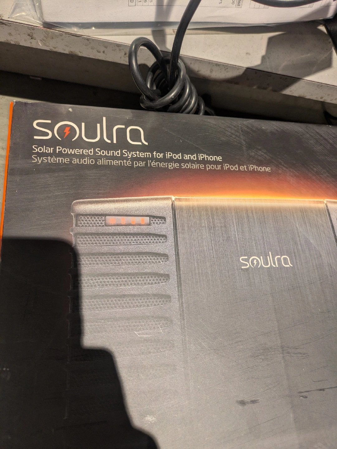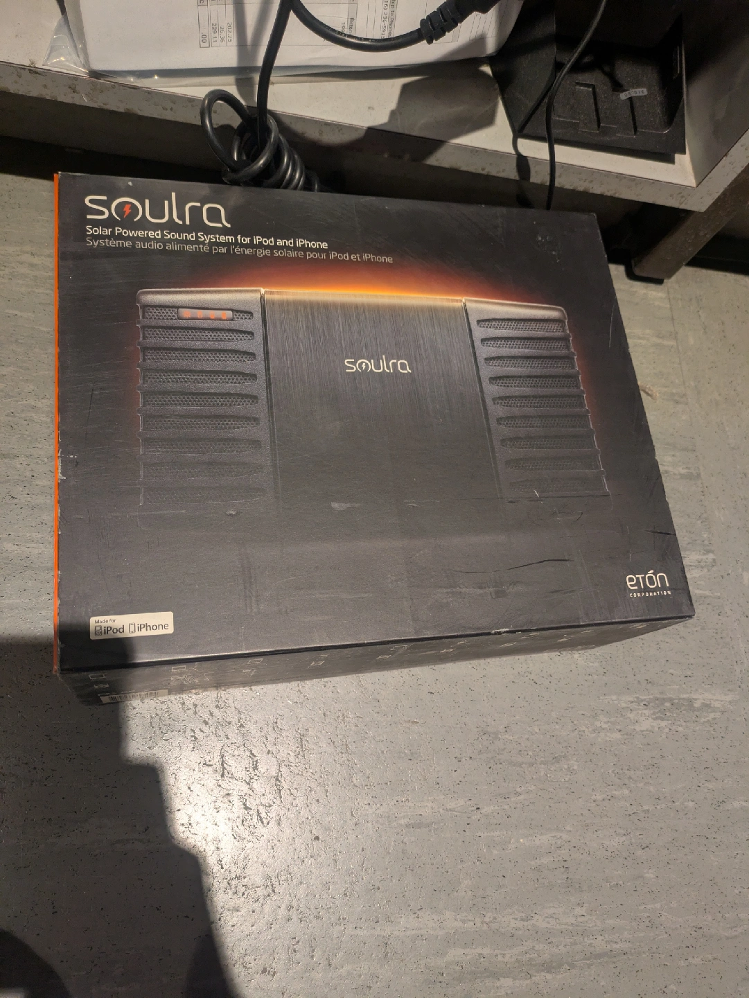 Selling a Soulra Solar Powered Sound System for iPod and iPhone. It's a great way to enjoy your music while being eco-friendly. It comes with the original box.