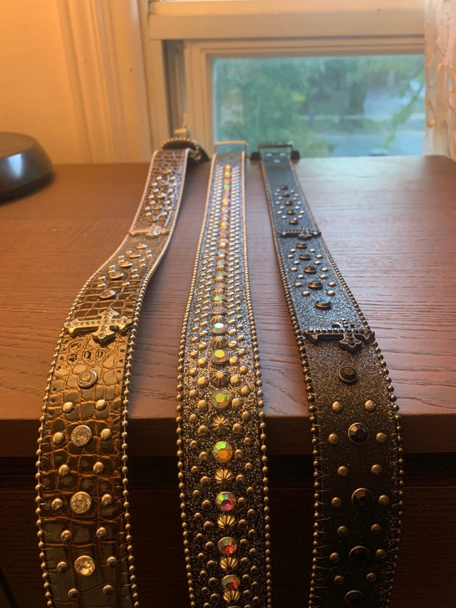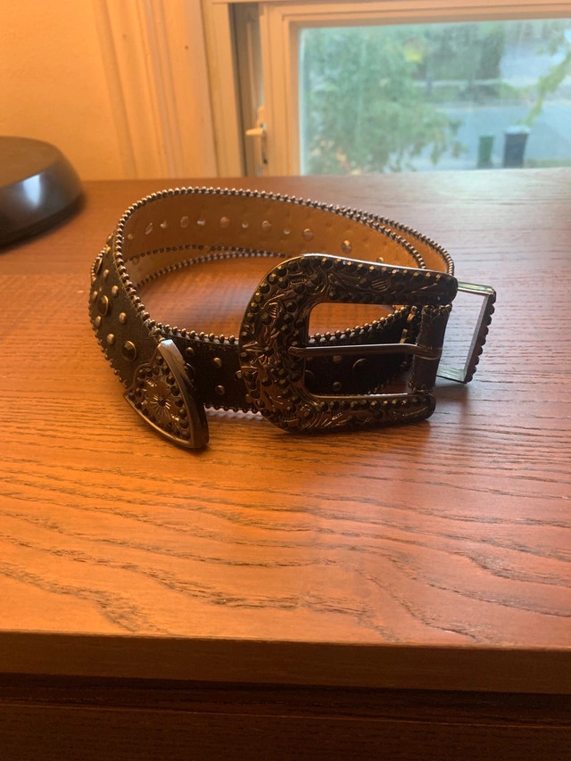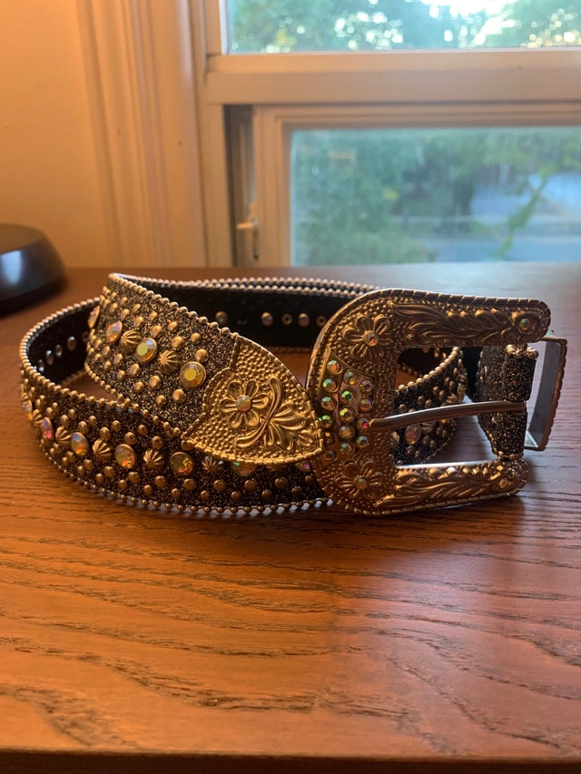 Add some sparkle to your outfit with this eye-catching rhinestone studded belt, perfect for making a statement! This belt features intricate detailing and is sure to turn heads. It's in good condition, ready to add some bling to your wardrobe. * Studded with rhinestones * Intricate buckle design *