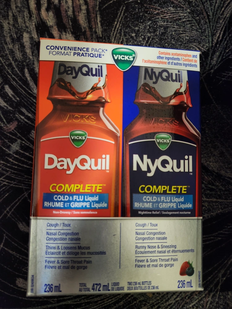 Selling a Vicks DayQuil & NyQuil Complete Convenience Pack! This pack contains both DayQuil and NyQuil for daytime and nighttime relief from cold and flu symptoms. It contains acetaminophen and other ingredients to help with cough, nasal congestion, fever, and sore throat. Expiry date is April 2026