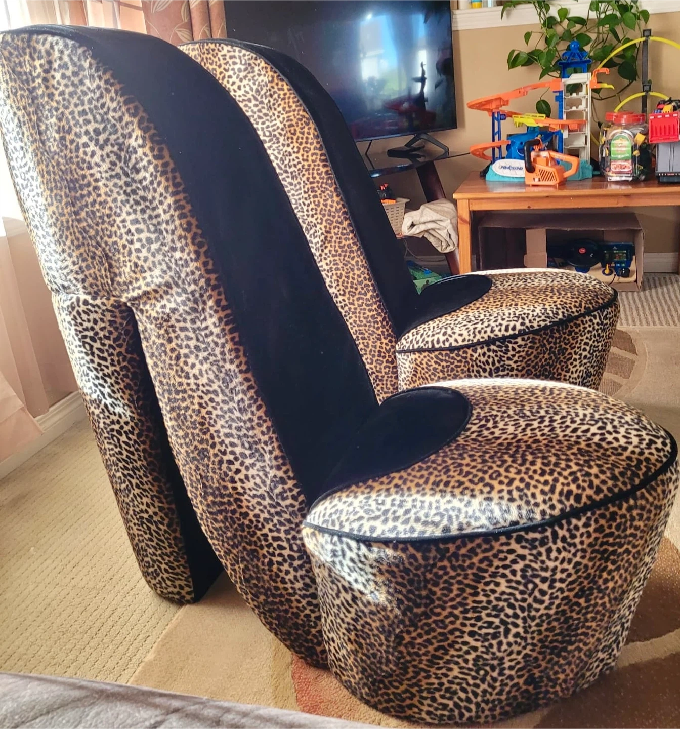 Selling a unique accent chairs shaped like high heels! A striking leopard print and black velvet-like upholstery. They're sure to add a fun and fashionable touch to any room