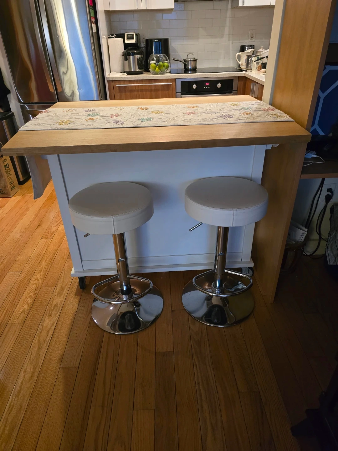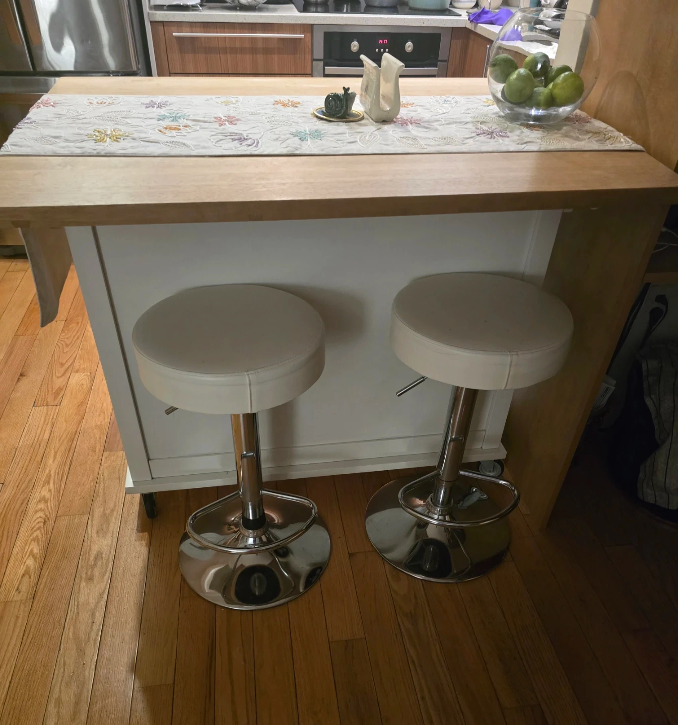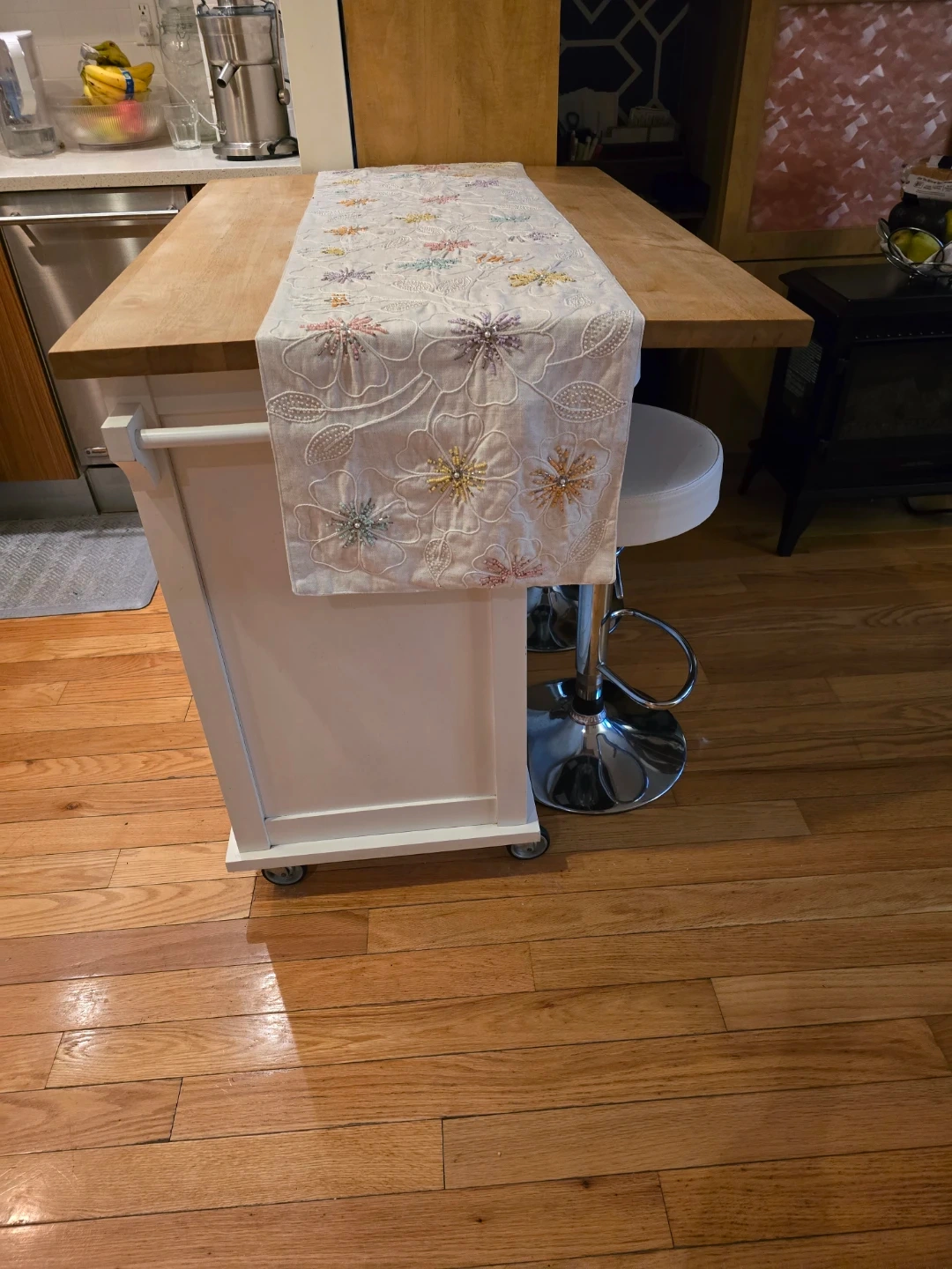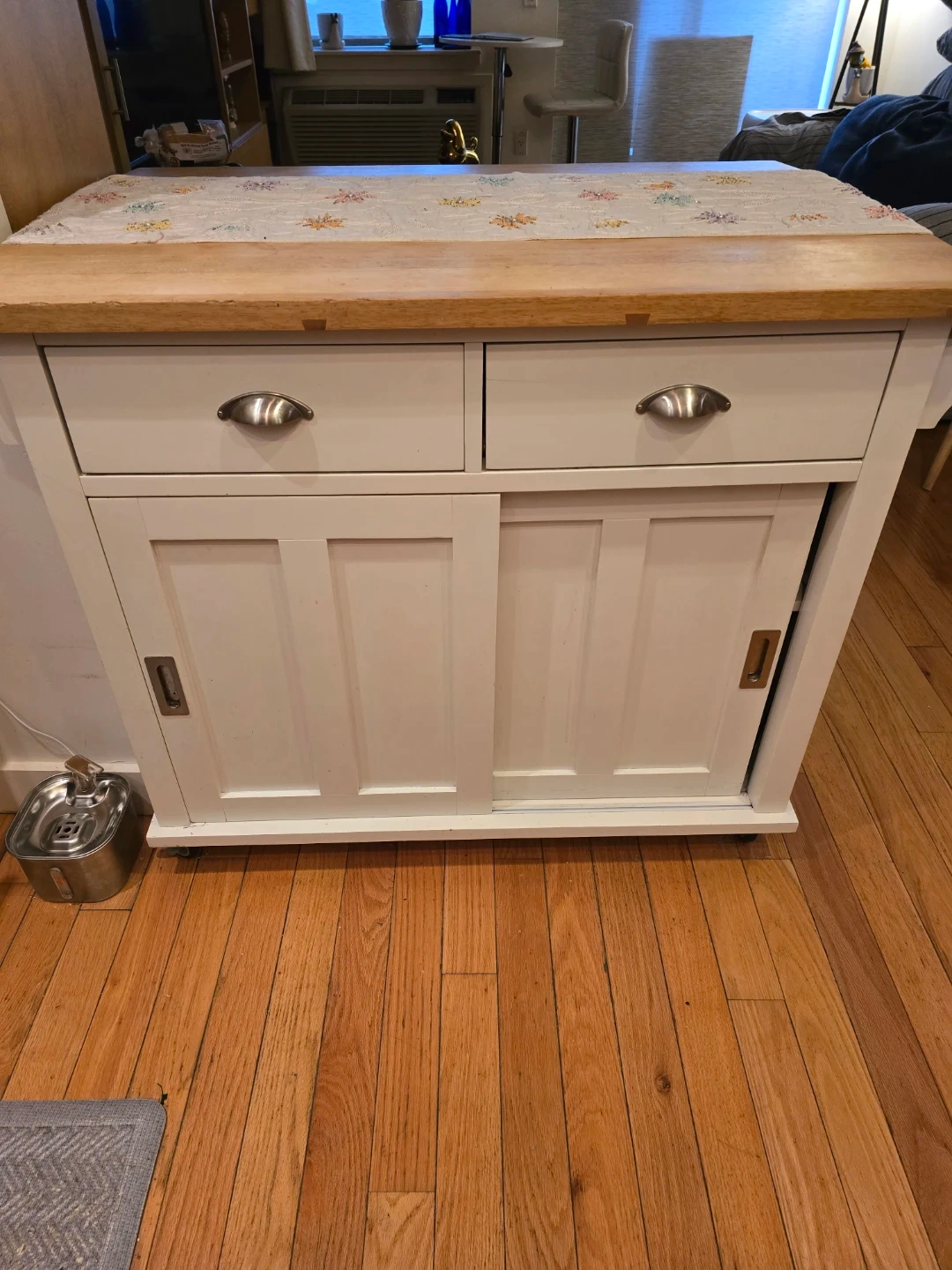 This kitchen island cart features a wood top and white cabinetry. It has two drawers on top and sliding doors on the front. It's on wheels for easy mobility.