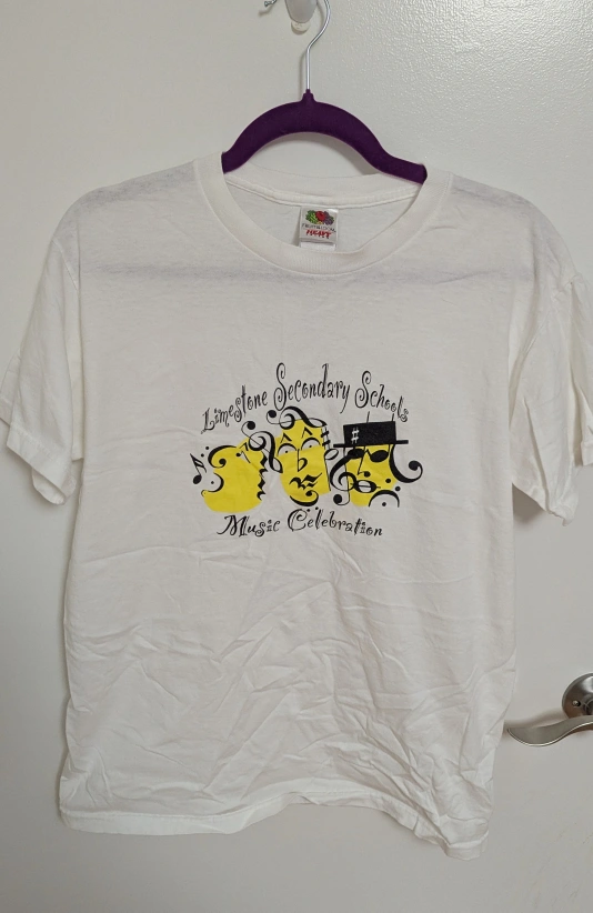 Selling a white Fruit of the Loom t-shirt in size medium. It features a design for the Limestone Secondary Schools Music Celebration. The shirt is made of 100% cotton and made in Honduras. Perfect for casual wear!