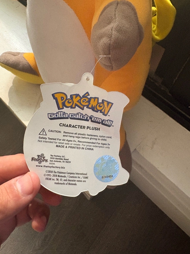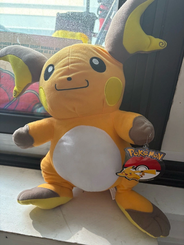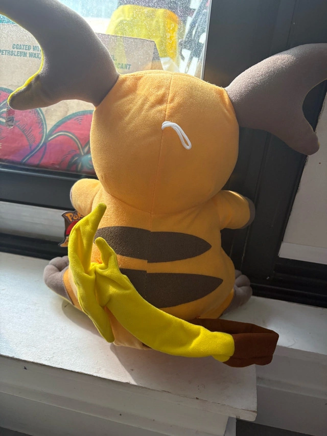 This is a brand new Pikachu Raichu Pokemon plush! It's super soft and ready for a new home. It's been sitting in storage. It measures about 16 inches tall. Brand new with tags mint condition.