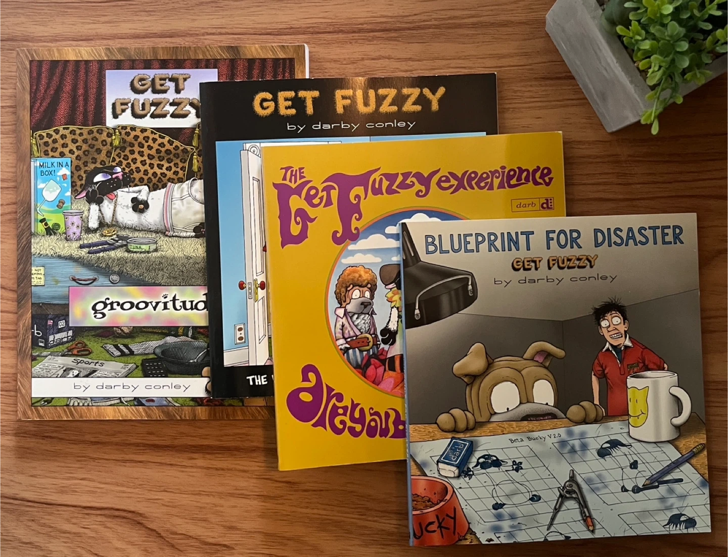Collection of four softcover books from Darby Conley featuring various Get Fuzzy comic strips. All are in excellent condition