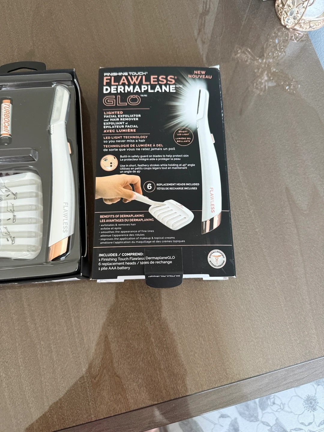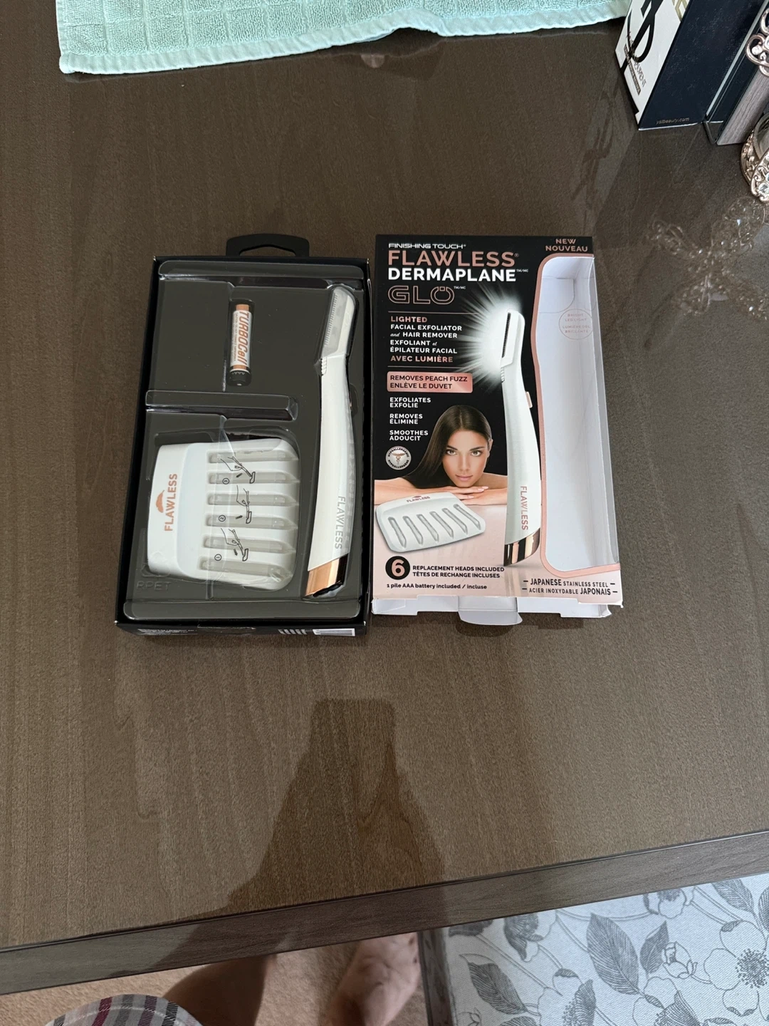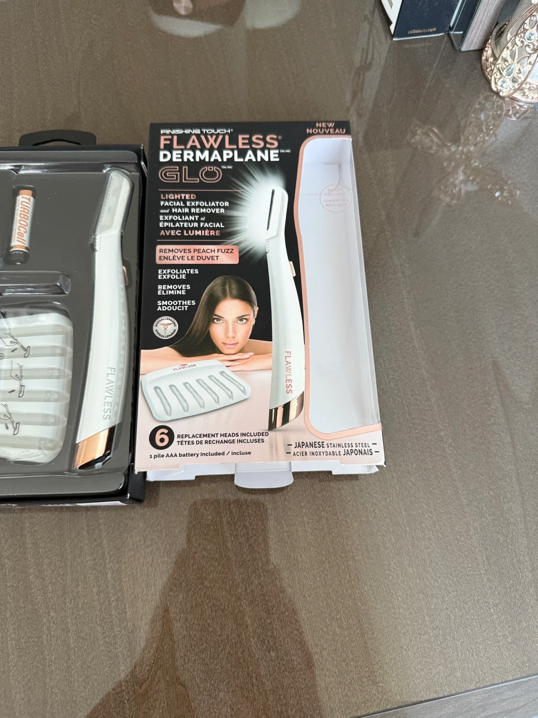 Selling a brand new Finishing Touch Flawless Dermaplane Glo! It's a lighted facial exfoliator and hair remover. It removes peach fuzz and exfoliates, leaving your skin smooth. The box includes 6 replacement heads and one AAA battery
