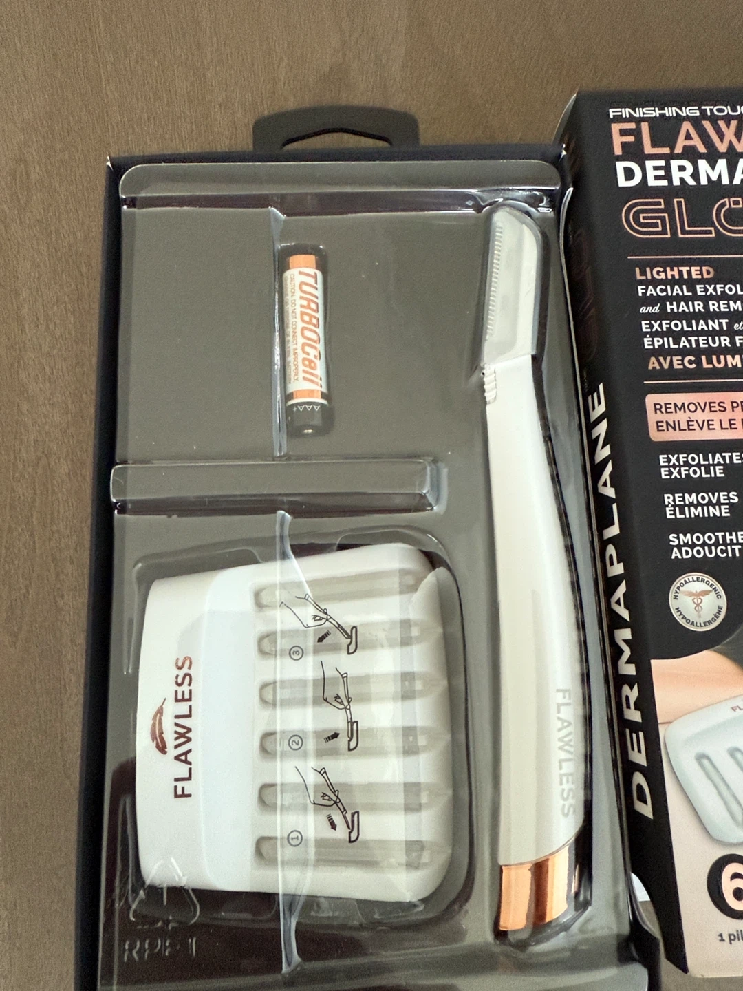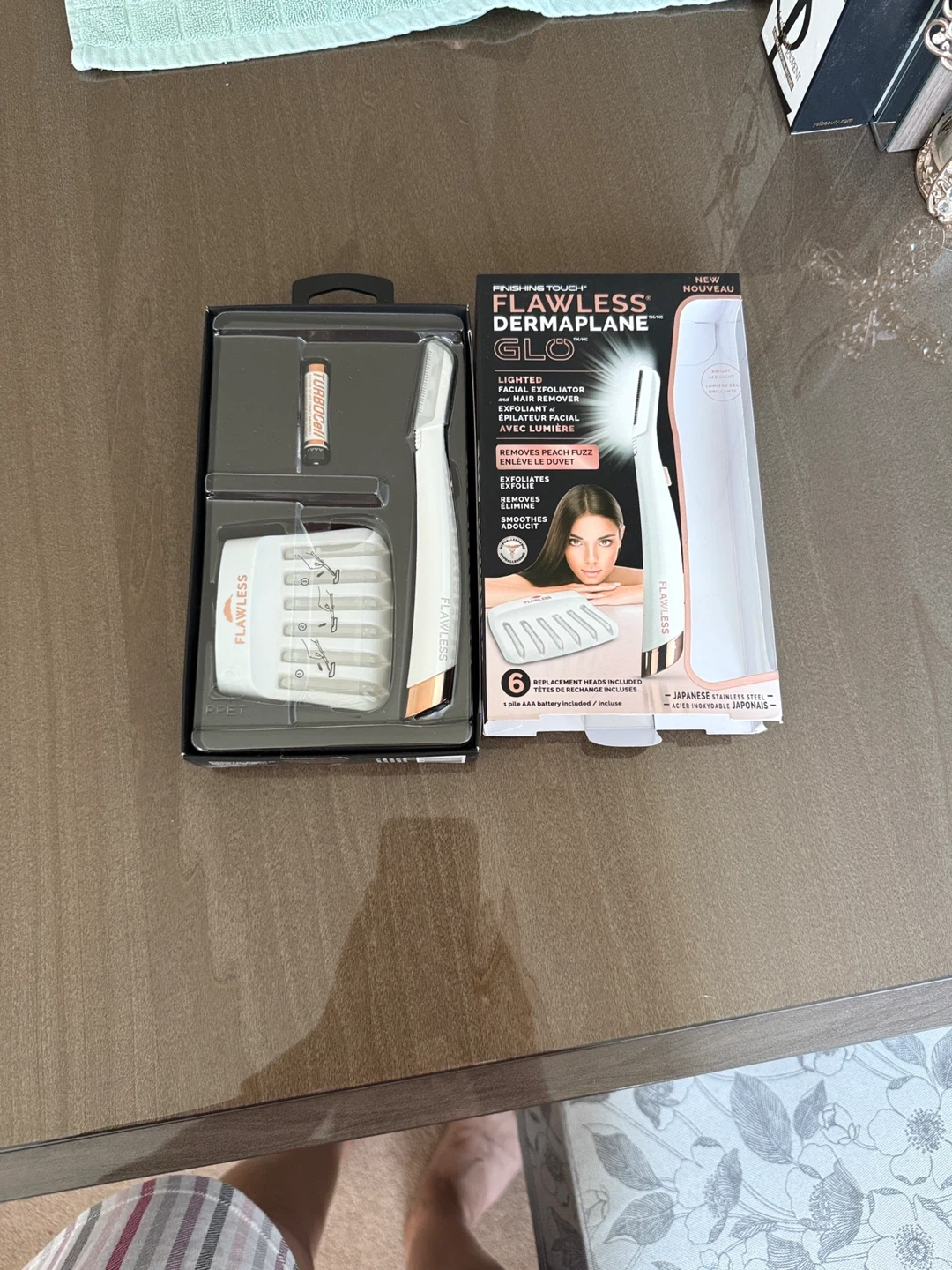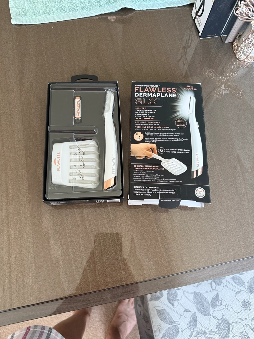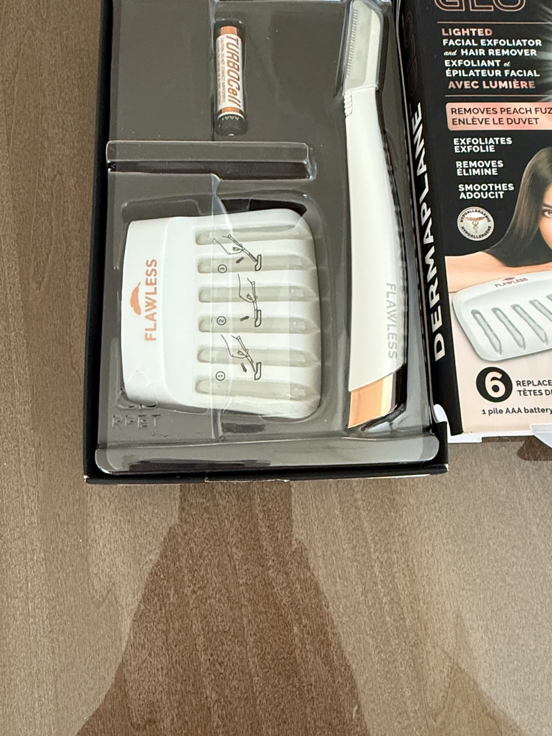 Selling a brand new Finishing Touch Flawless Dermaplane Glo! It's a lighted facial exfoliator and hair remover. It removes peach fuzz and exfoliates, leaving your skin smooth. The box includes 6 replacement heads and one AAA battery