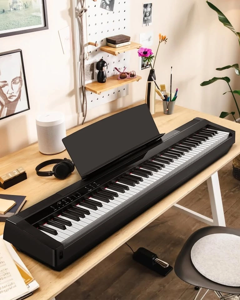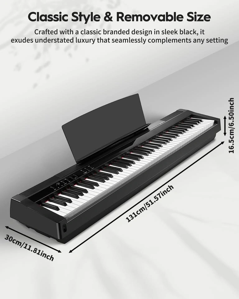 This weighted keyboard piano features fully graded hammer-action keys, matching the feel and size of a real piano. Lower keys feel heavier, upper keys lighter—offering an authentic and expressive playing experience.
