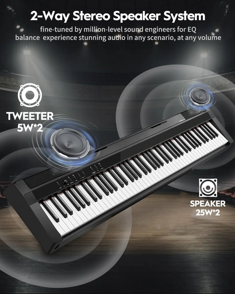 Equipped with a professional-grade 2-way speaker setup (5W×2 tweeters + 20W×2 woofers), this digital piano delivers rich, full-spectrum audio with crystal-clear highs and deep, resonant lows. Even in small rooms, you’ll experience room-filling stereo sound that brings your music to life.