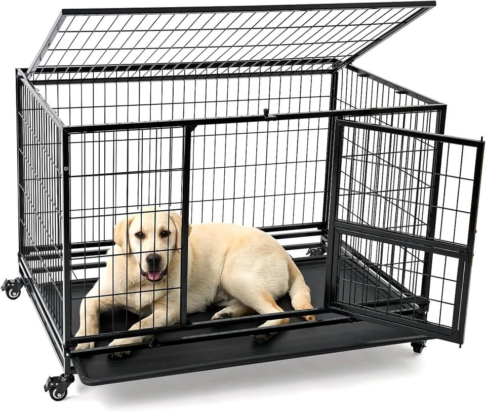 This heavy duty dog crate features a stackable design.